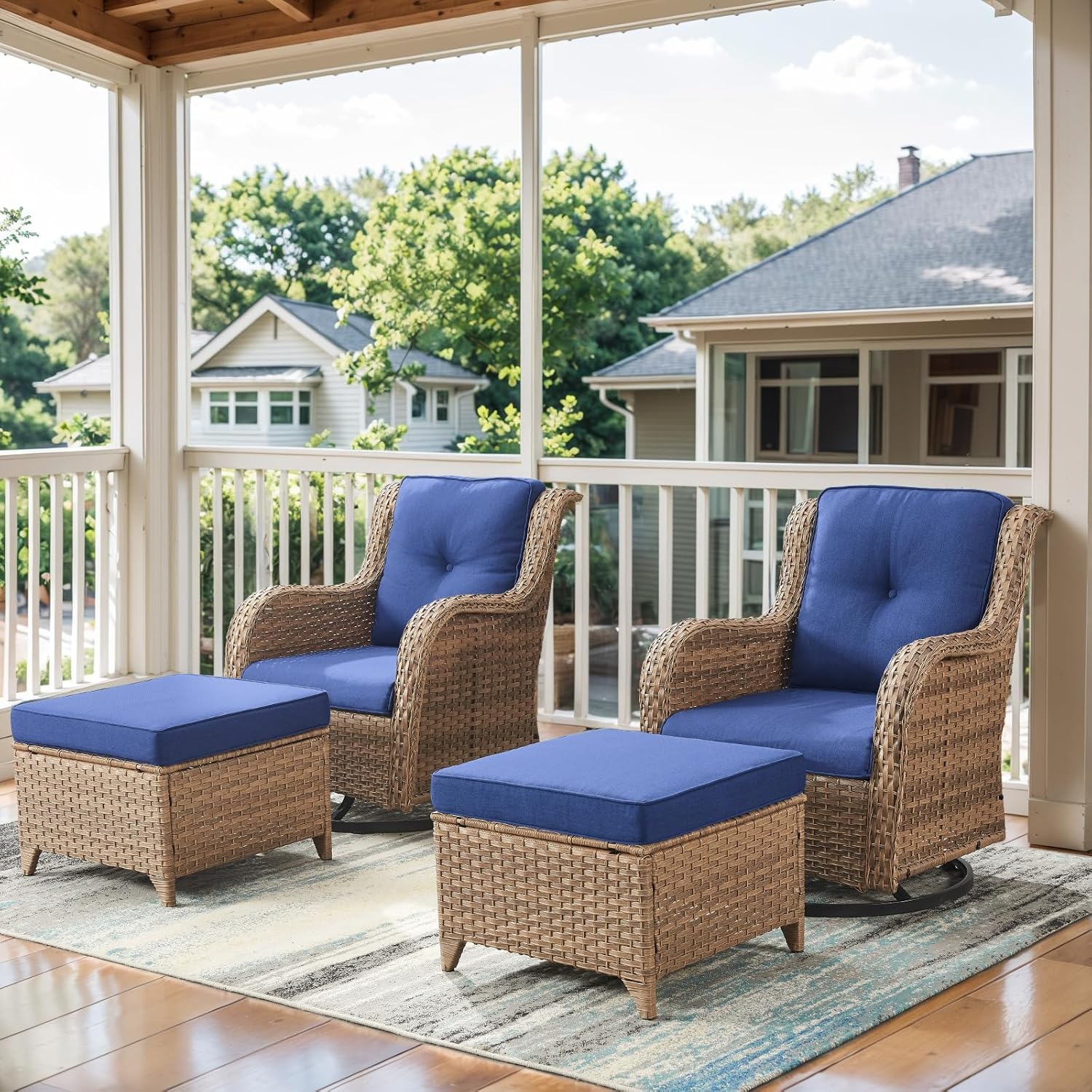 - Patio Furniture Set Introduction: The four-piece patio furniture set includes 2 swivel glider chairs and 2 ottoman, ottoman can not only be used to relax your legs, but also can be used as a small table or small stool. The swivel chairs can hold up to 350 pounds.