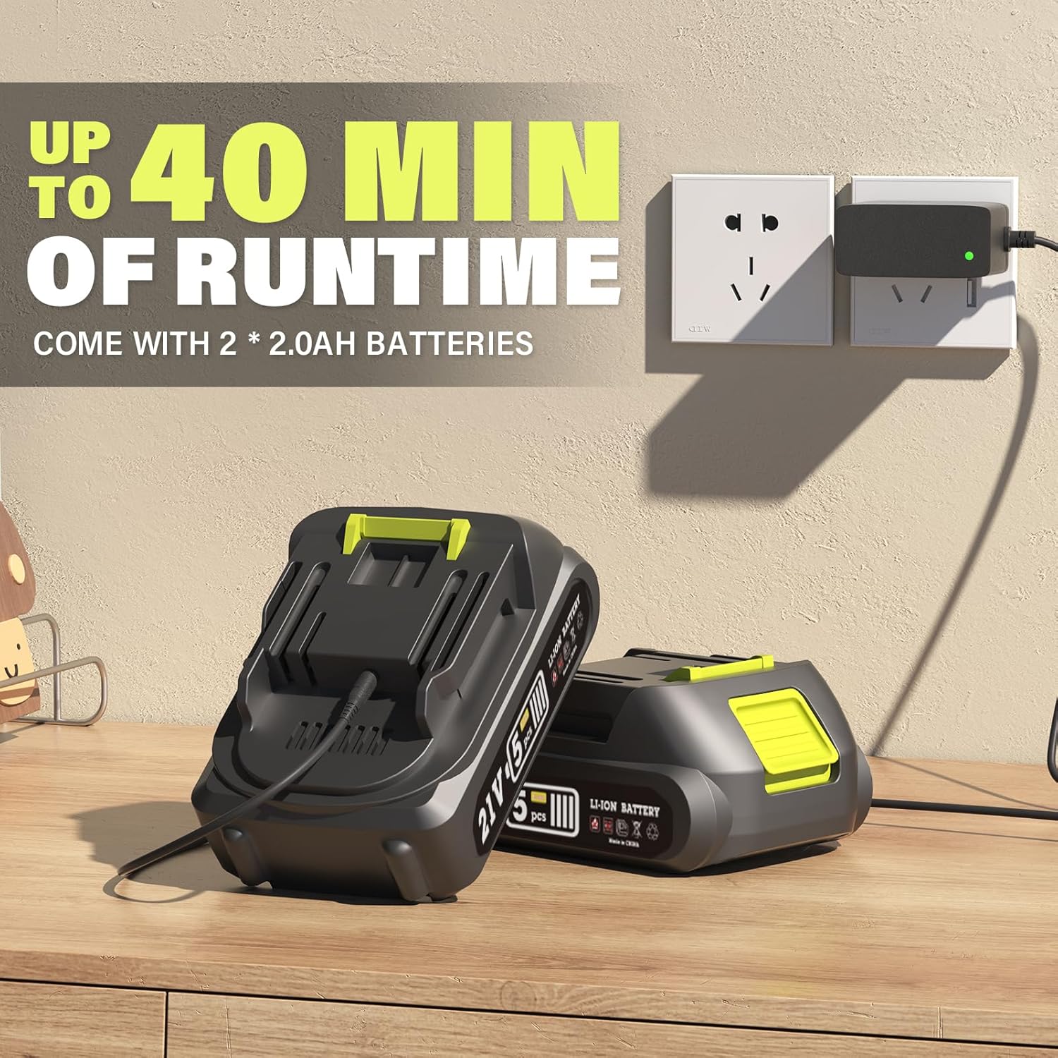- [ONE-STOP SERVICE] We provide a full set of services at one time, the product includes a bare tool, two 20V 2.0Ah batteries, a charger, two sections of air duct, a manual; the battery blower uses fast charging technology, fully charged in 90 minutes. The continuous working time is 25 minutes (high speed) and 40 minutes (low speed).
