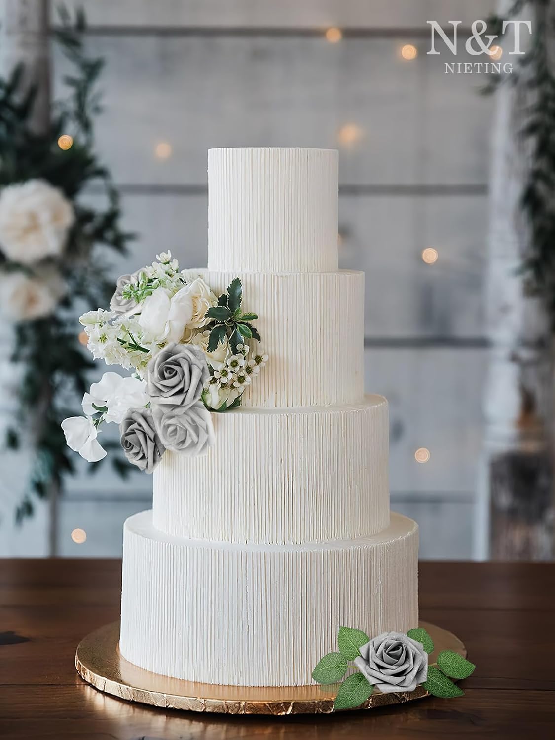 N&T NIETING Roses Artificial Flowers, 50Pcs Fake Flowers Foam Roses with Stems for DIY Wedding Bridesmaid Bridal Bouquets Centerpieces Party Home Decoration Baby Shower, Silver White and Silver Grey