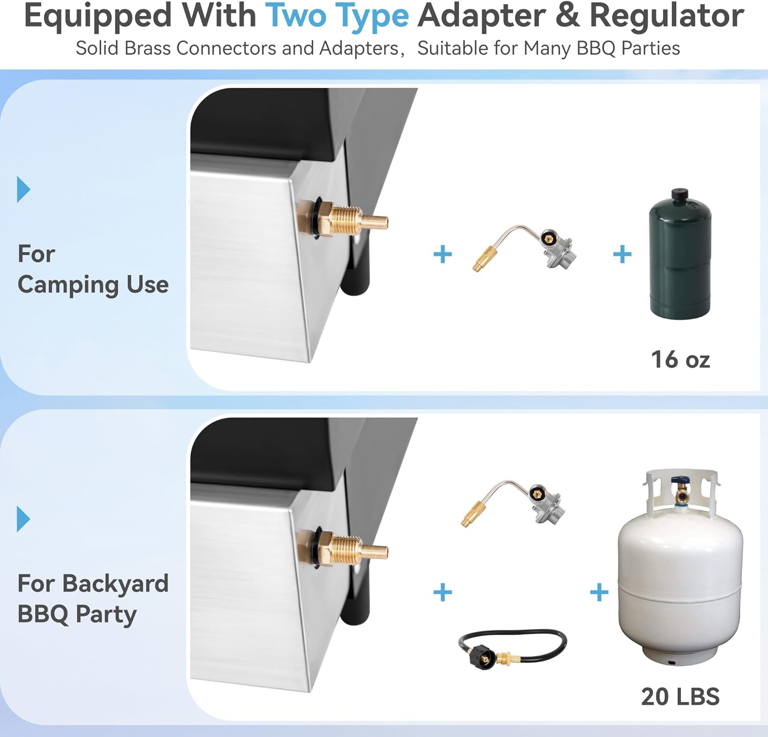 - PORTABLE TABLETOP GRILDDLE: Provide a FREE regulator to use it with 1 LB propane cylinders and a hose with an adapter on it to use a 20 LB LP tank. This flat top griddle makes cooking on-the-go easy and yum!. Lightweight and ultra-portable compact size, this 3-burner griddle is great for tailgating, picnicking, or camping