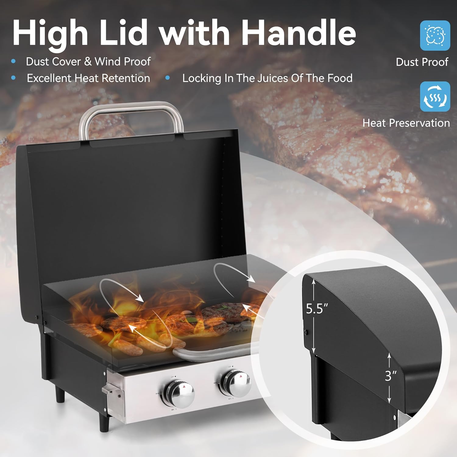 - PROTECTIVE HOOD: Griddle with Hood not only maintains the cleanliness of your griddle and shields its top from adverse weather conditions but also traps heat effectively during cooking