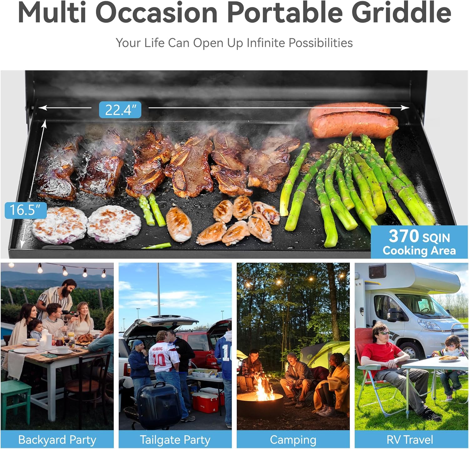 - SURPRISING COOKING SPACE: Make up to 14 burgers, 10 pancakes, or 60 hot dogs using tour ceramic coated cast iron griddle 370 square inches of cooking space, which is perfect for small families or groups