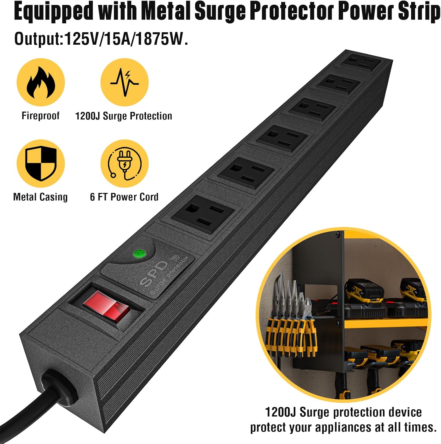 - 【EQUIPPED WITH SURGE PROTECTION POWER STRIP】: You can charge all your power tools directly on the tool shelf without needing to look for an outlet. Output: 125V/15A/1875W, 6Ft 14AWG power cord included.