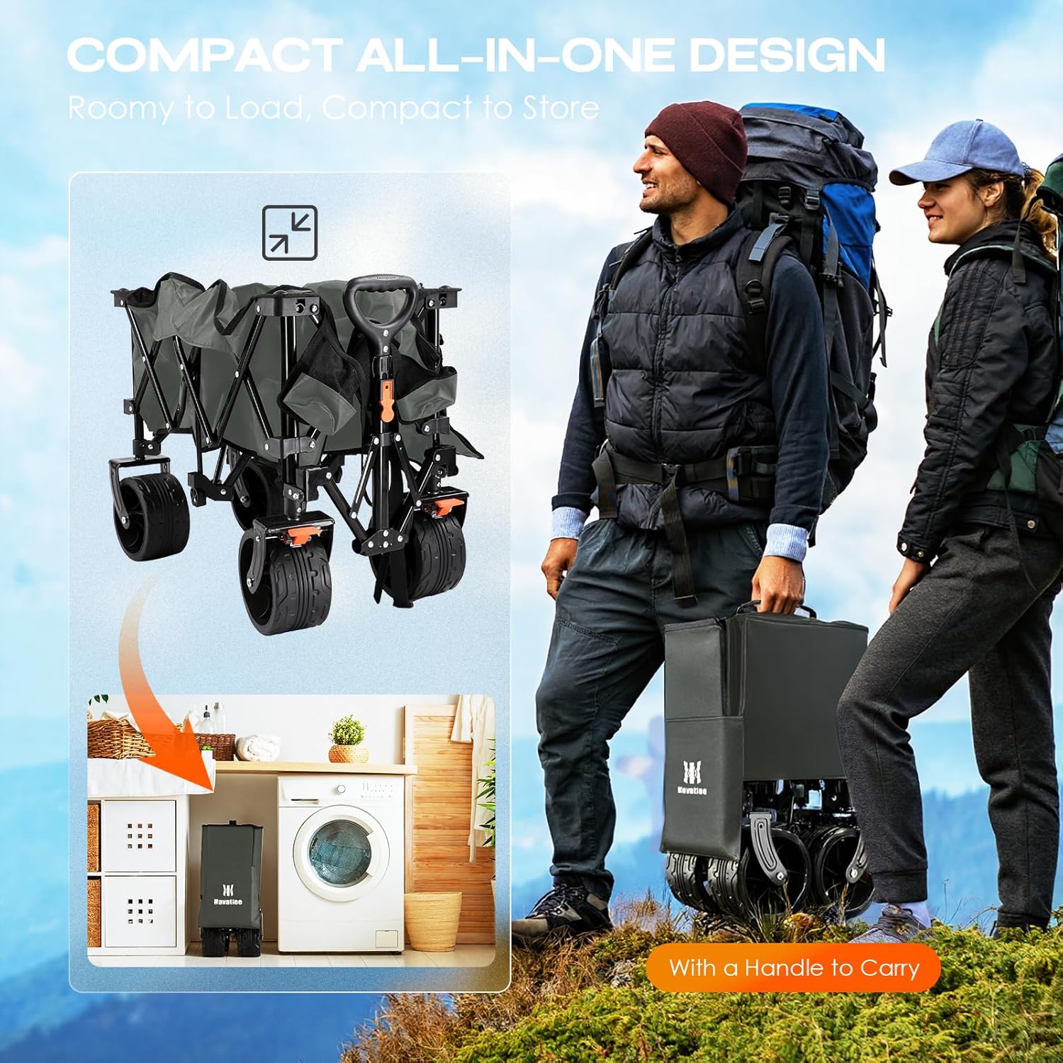 Navatiee Big Wheels Collapsible Wagon Cart Foldable, Heavy Duty Beach Wagon with Silent All-Terrain Wheels, Folding Utility Grocery Cart with Side Pocket and Brakes for Camping Garden Sports, Gray