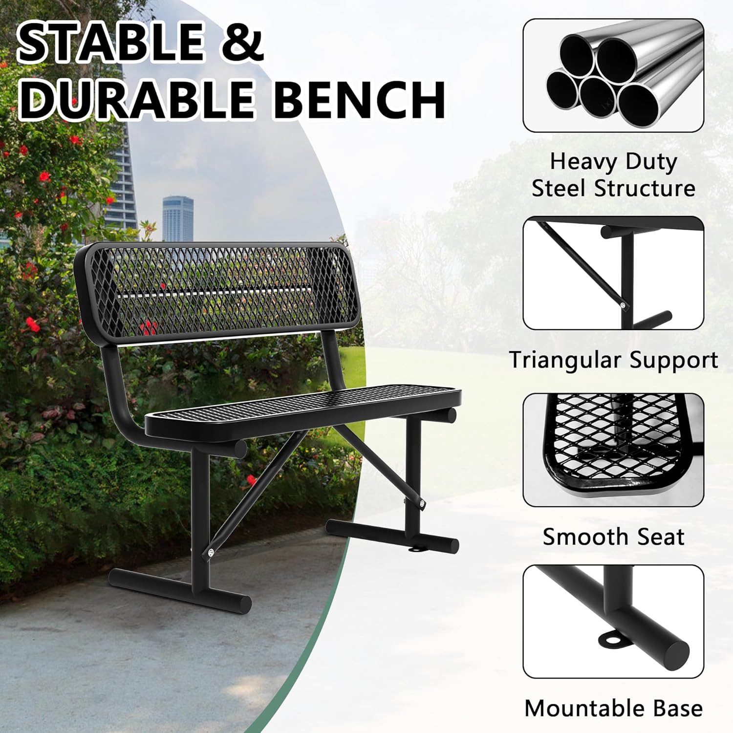 - High Quality Park Bench: This portable outdoor bench is made of high-strength steel with a powder coating on the surface, which is rust proof and waterproof. It can withstand extreme weather conditions throughout the year and is very suitable for outdoor use. It is suitable for various outdoor or indoor places, such as courtyards, backyards, gardens, pool sides, and living rooms.