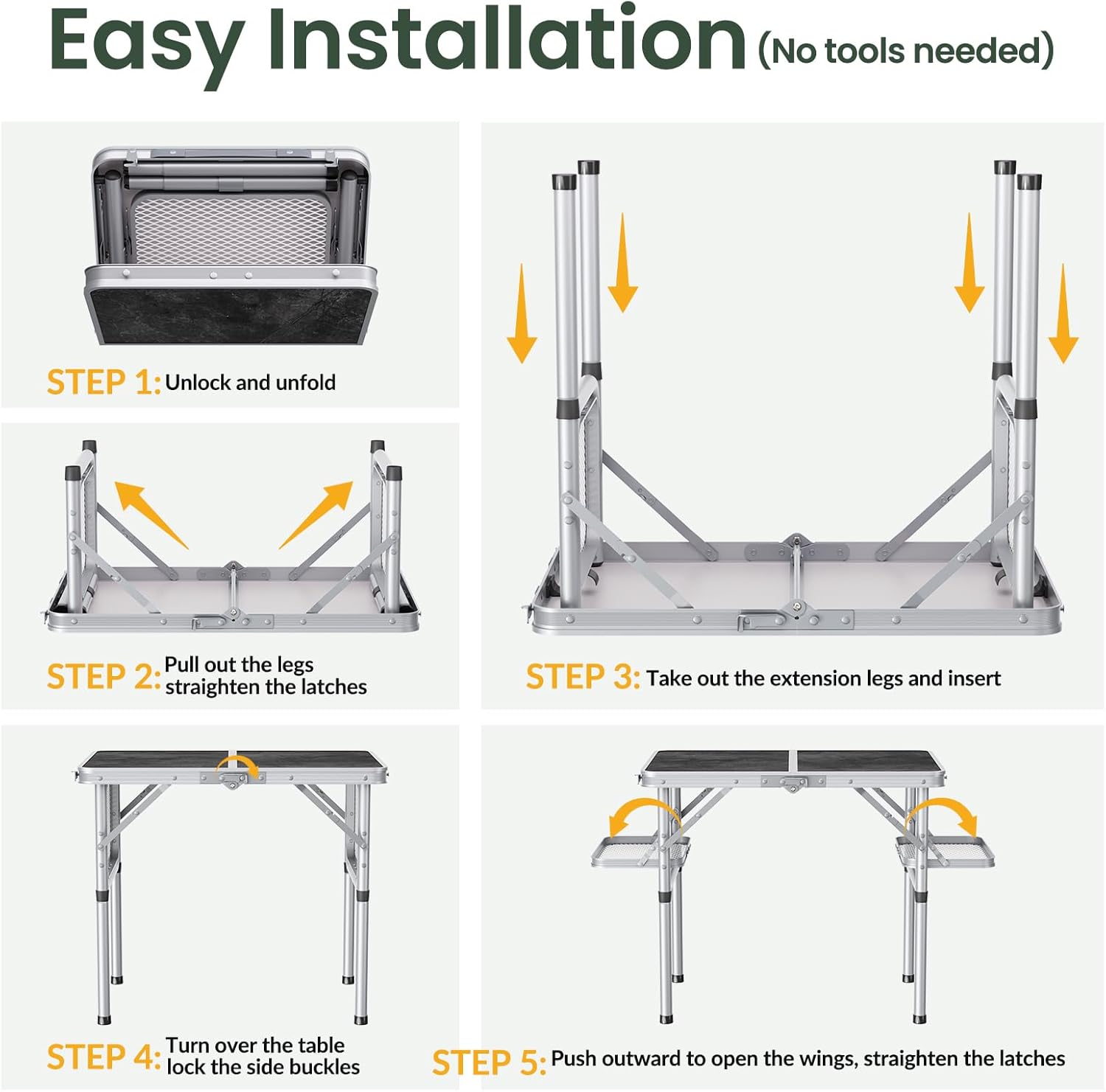 - Simple 5-step Installation (No tools needed). Step 1: Unlock and unfold. Step 2: Pull out the legs and straighten the latches. Step 3: Take out the extension legs and insert. Step 4: Turn over the table and lock the side buckles. Step 5: Push outward to open the wings, straighten the latches. Done. Please refer to the installation steps in the picture and the video.