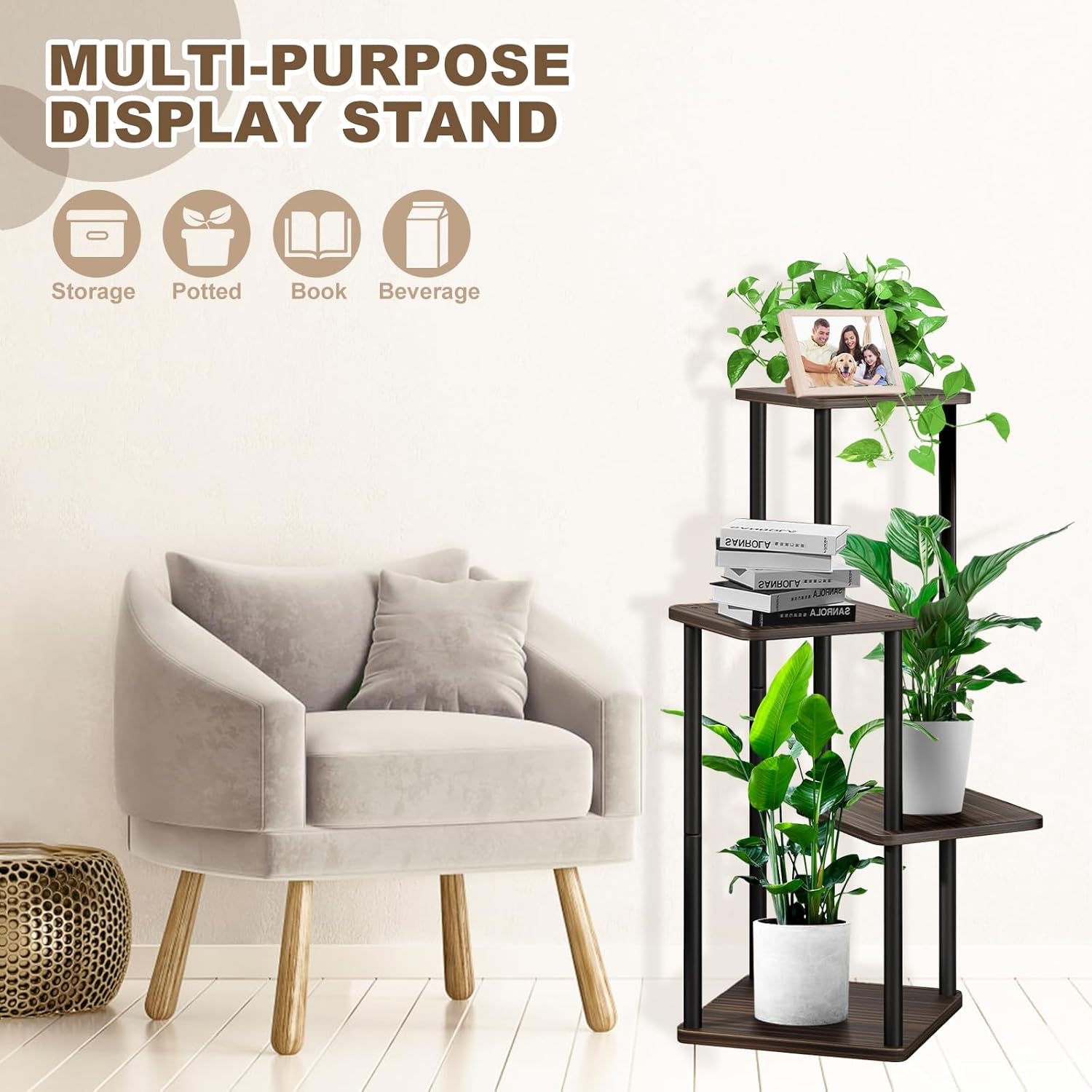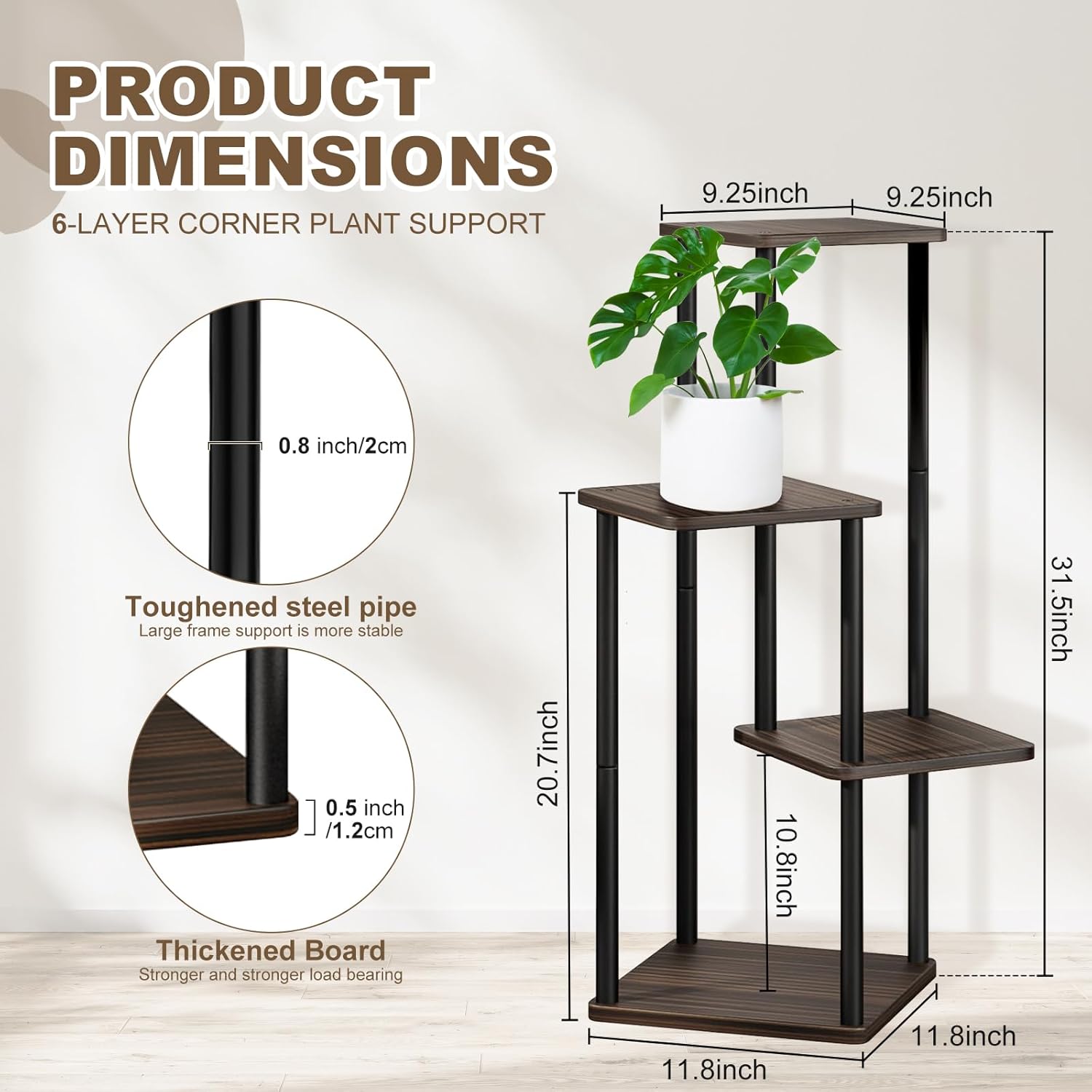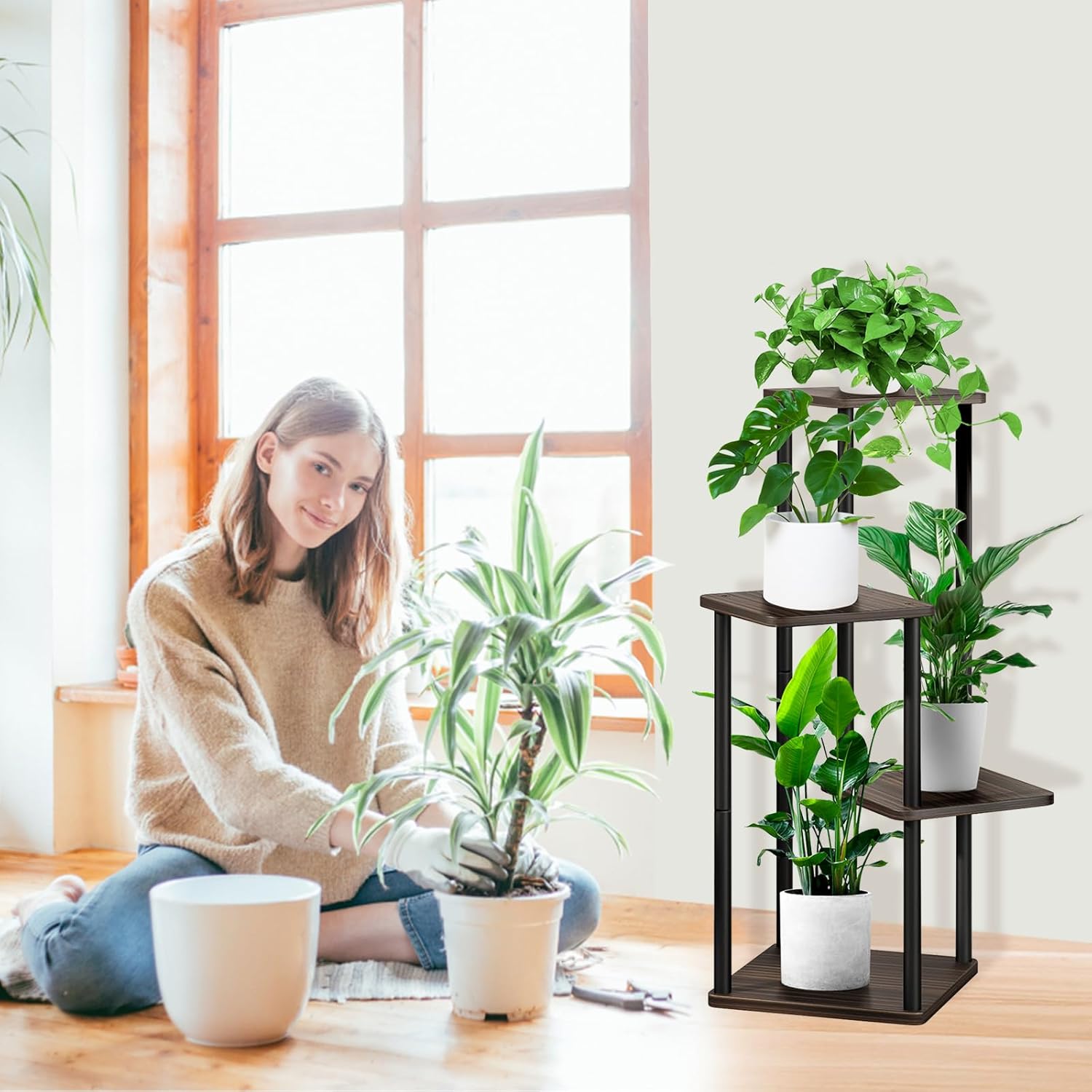 4 Tier Wood Tall Plant Stand Metal Rack Indoor, Multiple Flower Pot Holder Shelves Corner Rack, Planter Shelf Display Rack Storage Organizer for Patio Living Room Balcony Garden(Black Oak)