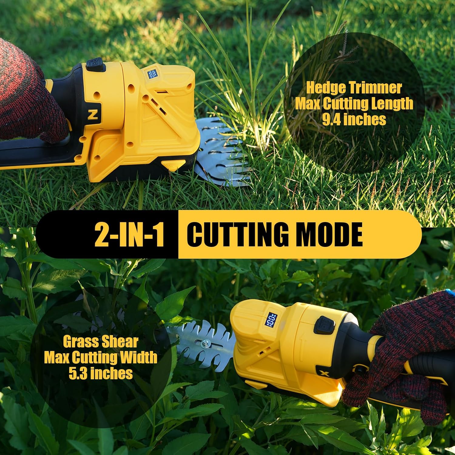 - 2-IN-1 Grass Trimmer: Wellanpower Grass Trimmer machine effortlessly swith a switch for quick and easy transition between grass shear and hedger with blade release buttons. 5.3-inch wide short blade cuts grass and small lawn sections, while the 9.5-inch long blade trims thin shoots on hedges, bushes, trees, and ornamental shrubs. 【Note】: Please store the blades in a dry condition to prevent rust.