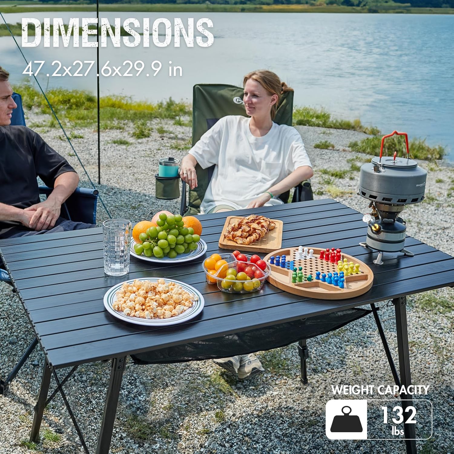 - Compact Size and Lightweight: Set up dimensions: 47.2'' L x27.6'' W x29.99'' H; Folded dimensions: 6.7'' L x5.9'' W x48'' H; Product weight: 13.2 lbs (6 kg); Weight Capacity: 132 lbs (60 kg); our folding table can be used anywhere - it can be used as a portable picnic table, RV table, BBQ table, grill table, camp stove stand, card games table and tailgate table