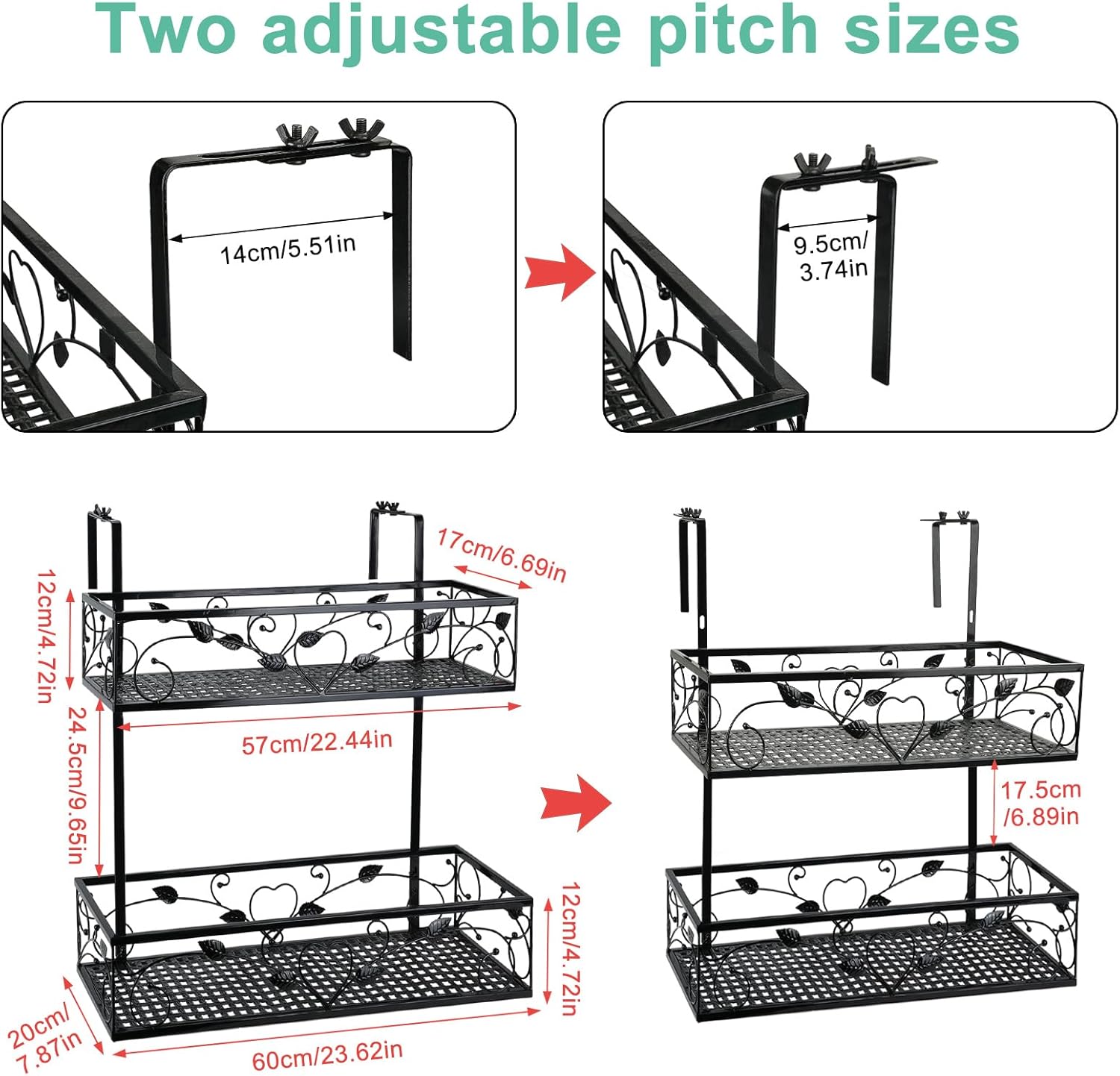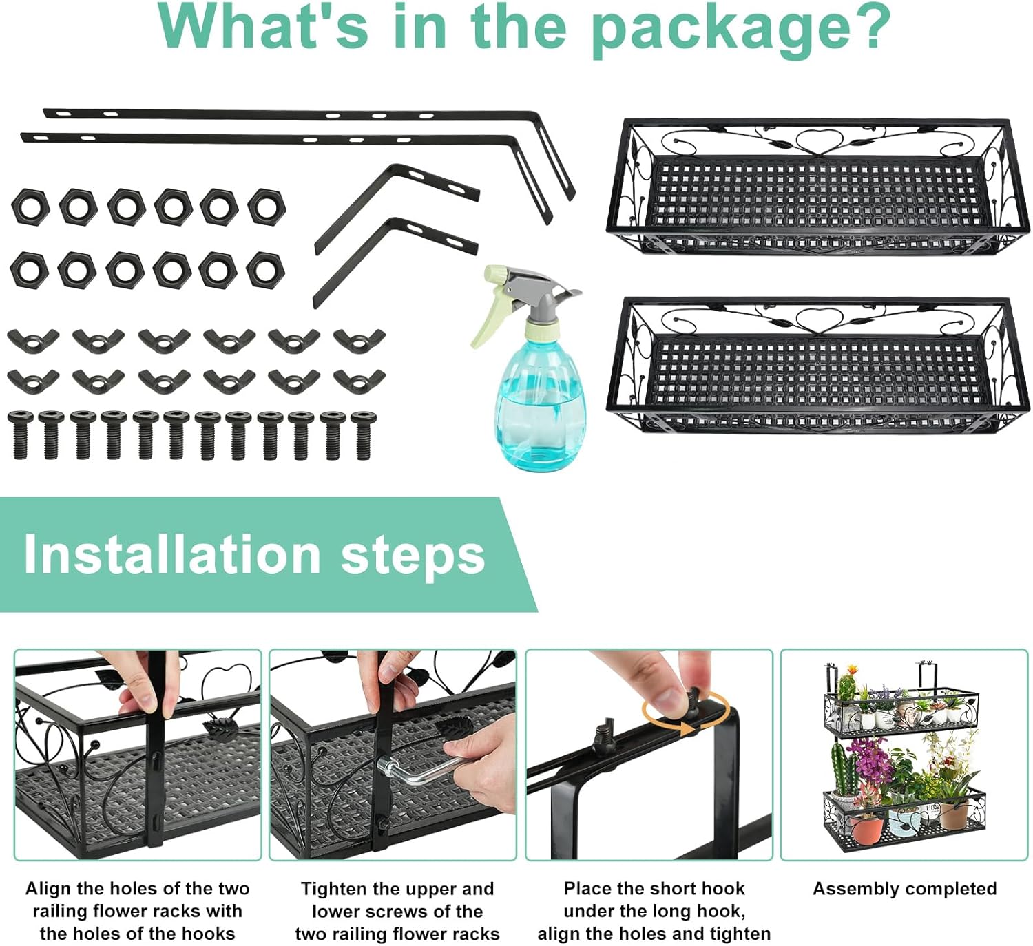 - 2 Tiers Large Capacity Hanging Planter Shelf : The planter basket is designed with an artistic square shape, and overall measures 24*8*23.2in(L x W x H), providing large space for putting succulents and small potted plants. The width of the adjustable railing planter can be adjusted from 2.1" to 4.9" and the hook has multiple holes, which can adjust the height of the flower basket according to your needs. And it can not only let your plants enjoy enough sunlight for better growth while making your balcony more charming. With a gardening spray bottle for plants beauty