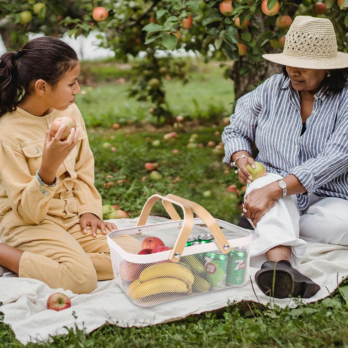 Wire Mesh Storage Organizer Basket Portable Garden Harvest Basket Fruit Basket Bin with Wood Handle Ideal for Kitchen Picnic Pantry Cabinets Storage Home Decor (Cold Gray)