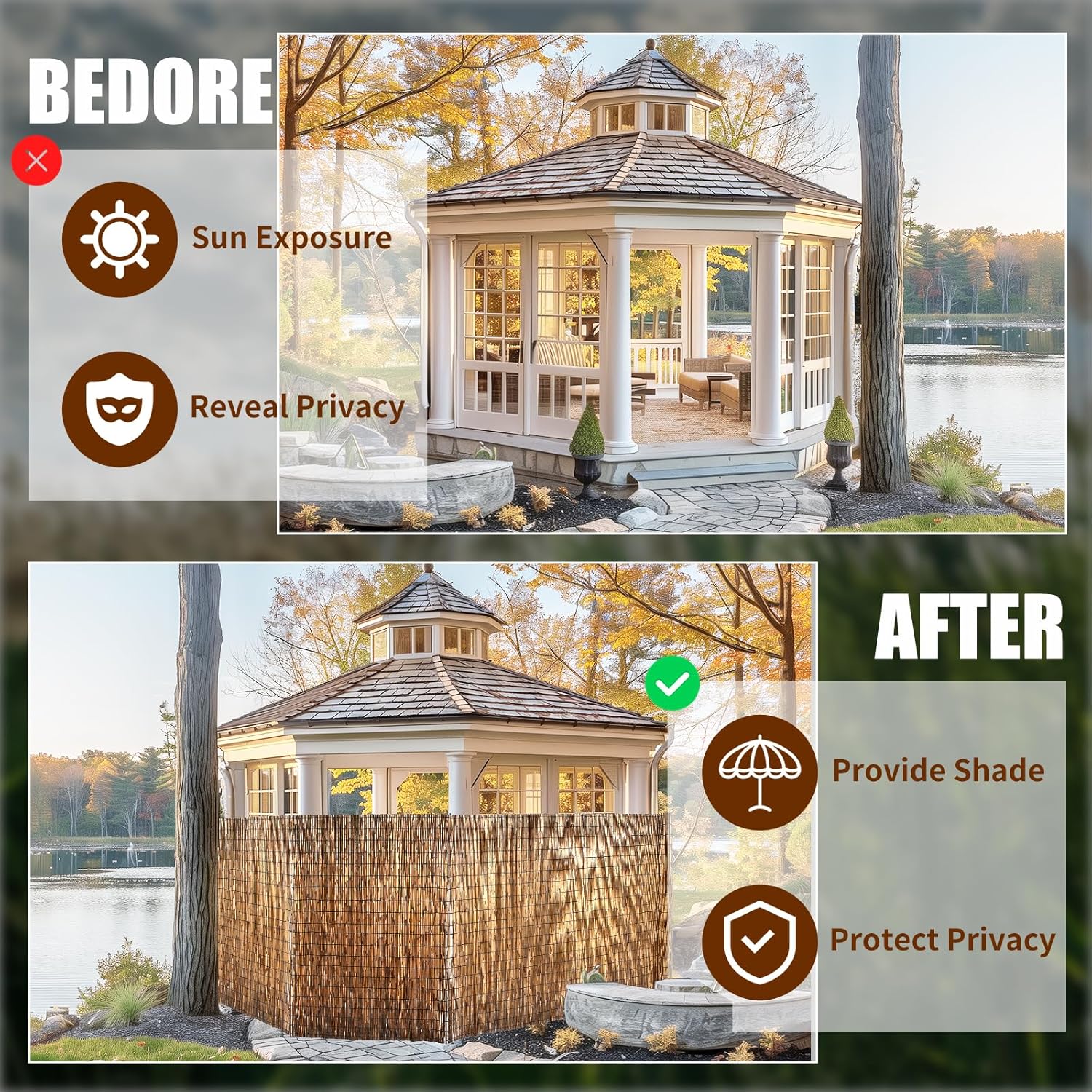 - More Shade and Privacy:This reed screen is made of natural reeds, tightly woven together to block sunlight and block the view of neighbors. In addition, the reed screen allows weak light to pass through, providing necessary light for reading or daily activities