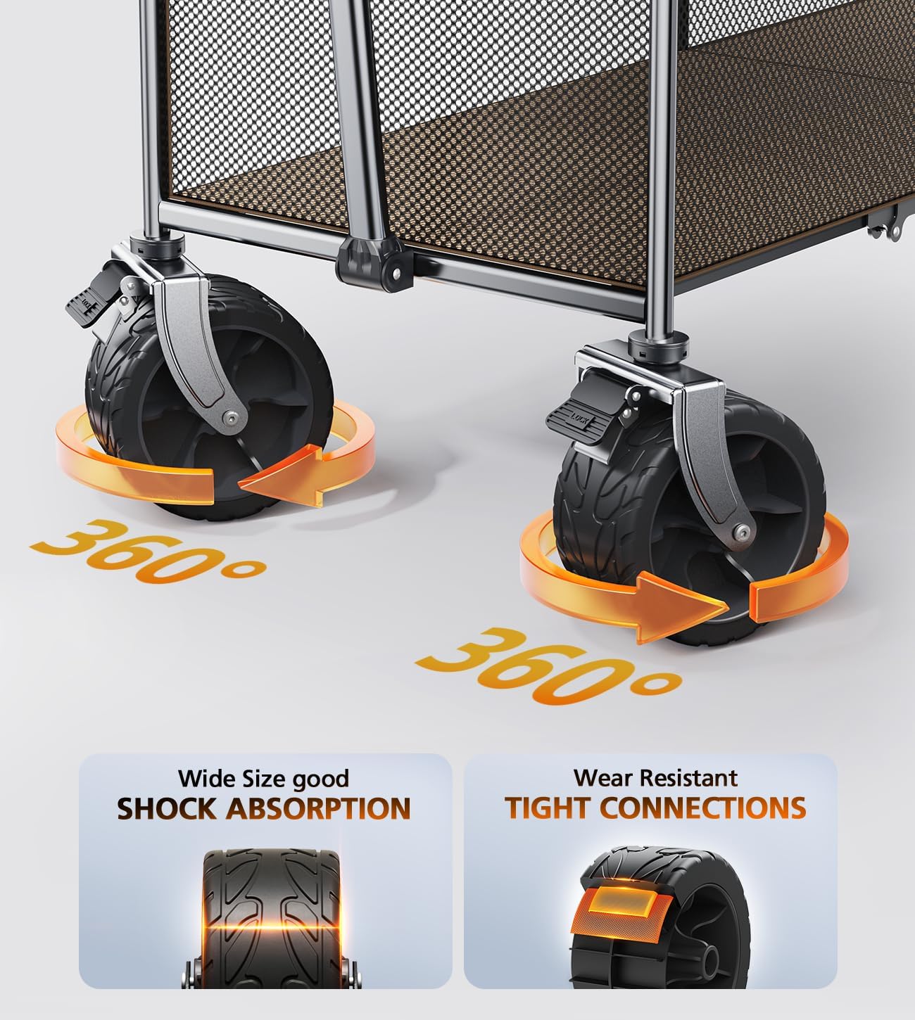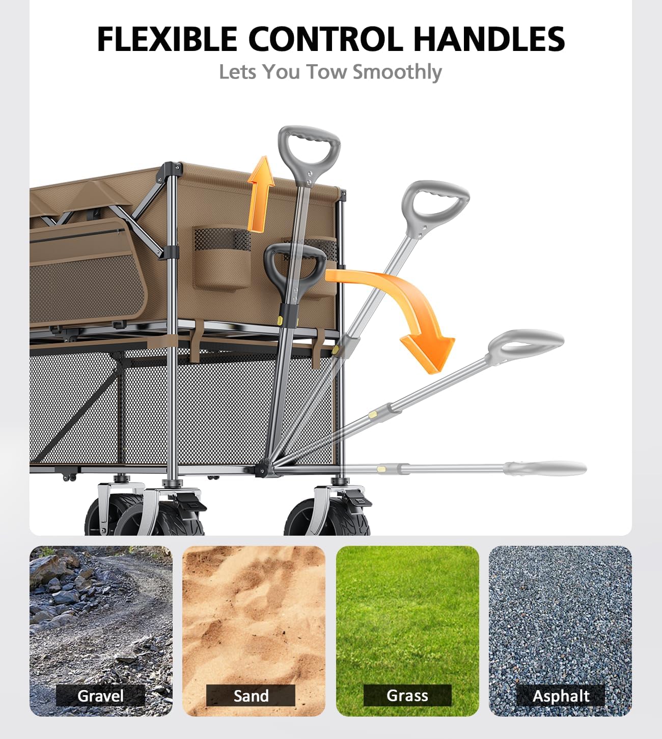 - All-terrain Off-road Carts Wheels. The premium beach carts with wheels for all ground are strong abrasion resistance, silent shock absorber, wear-proof, no drag marks. It can walk all terrains- concrete, grass, rock, mud. Handles like a dream on hills too.