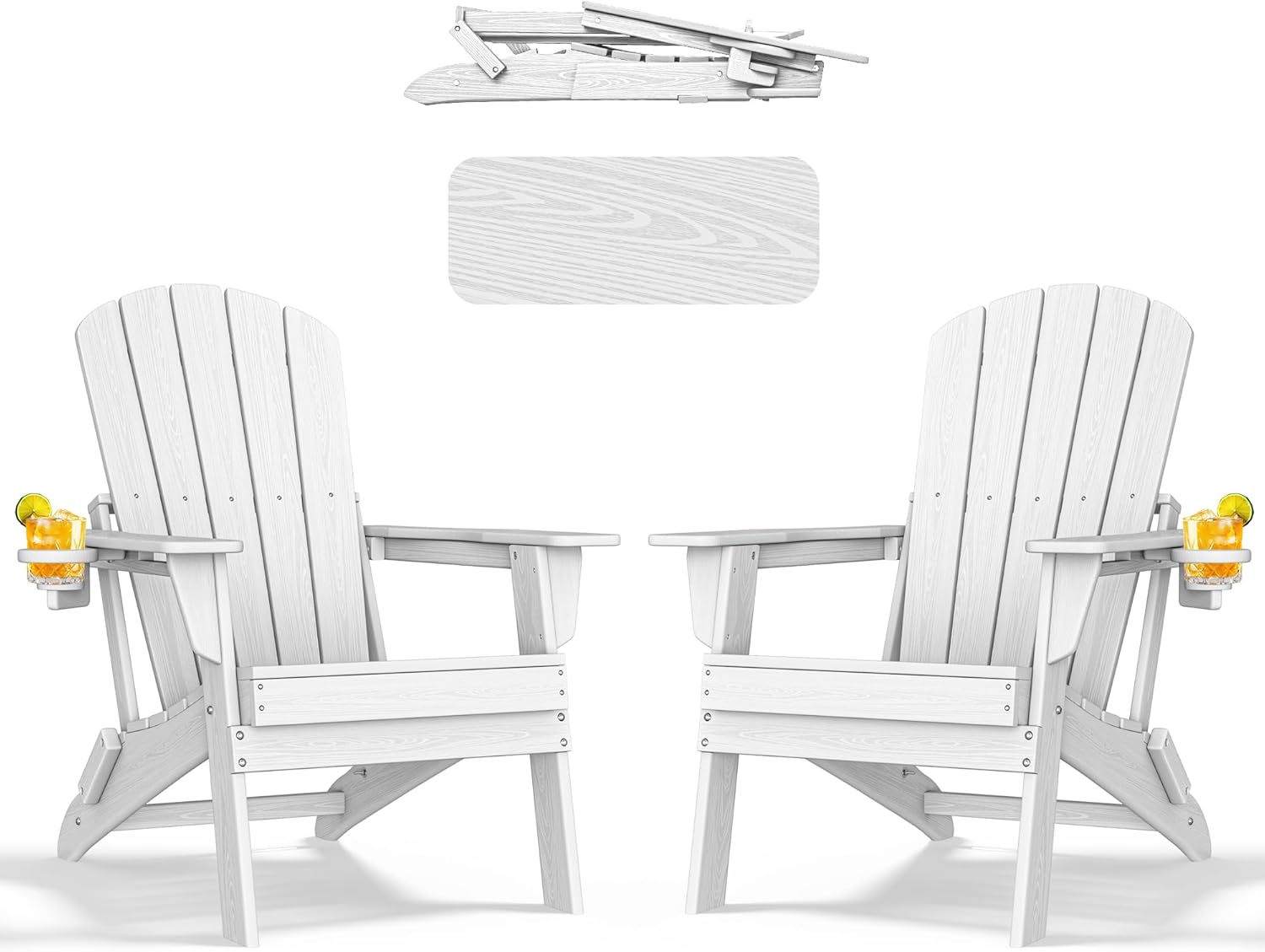 Folding Adirondack Chair - Extended Ergonomic Backrest, Cup Holder - Easy Assembly - Durable HDPE Plastic, Weather Resistant & Maintenance-Free - Lawn, Patio, Deck Supports 380lbs White
