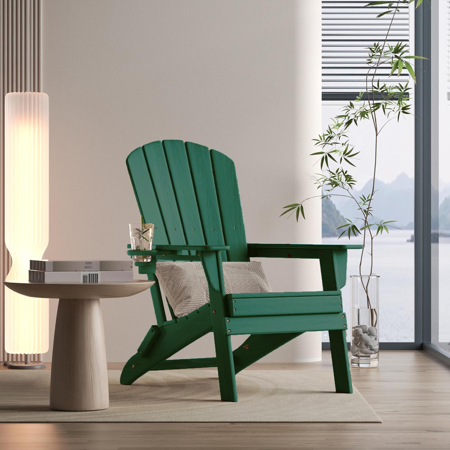 Folding Adirondack Chair - Extended Ergonomic Backrest, Cup Holder - Easy Assembly - Durable HDPE Plastic, Weather Resistant & Maintenance-Free - Lawn, Patio, Deck Supports 380lbs Green