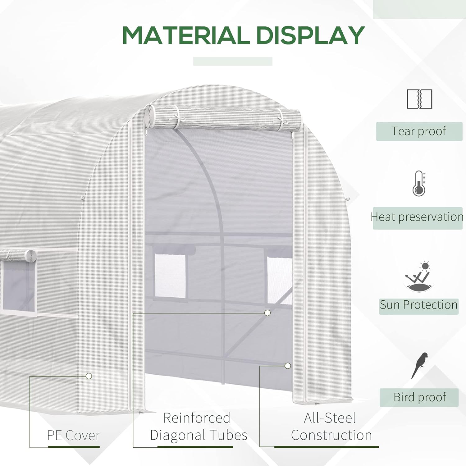 - Transparent Plastic Cover: Shield your plants effectively with our tunnel greenhouse's 140gsm PE cover, which allows 85% sunlight penetration while protecting against UV damage. The cover features a tear-resistant reinforcement grid. 6" extended edges enhance stability and effective rainwater sealing.