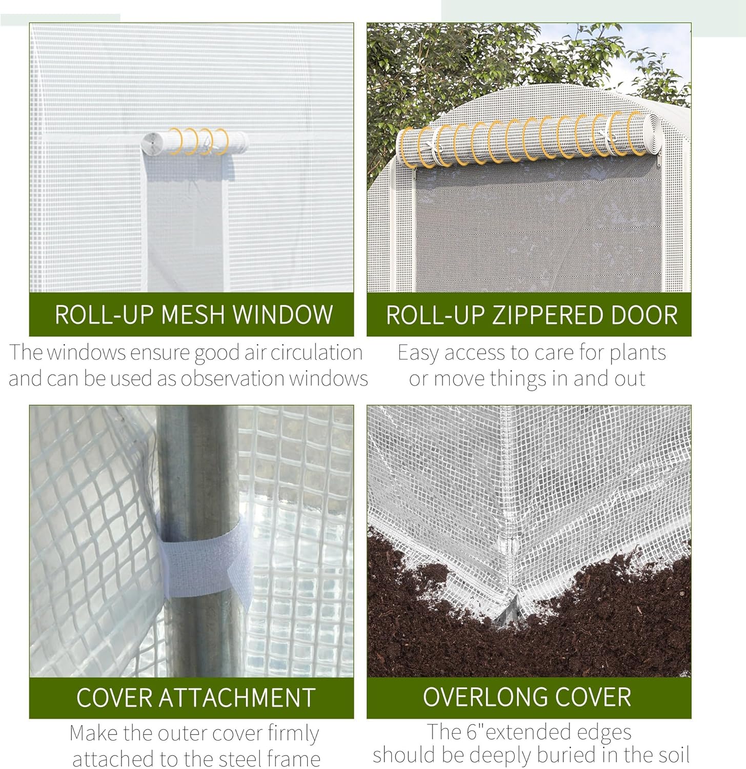 - Ventilated Roll-Up Windows and Doors: Regulate moisture with six roll-up windows and manage air flow with the large, zippered door of our outdoor greenhouse. These features allow for fine-tuned ventilation, helping to maintain optimal growing conditions while providing easy access and secure closure.