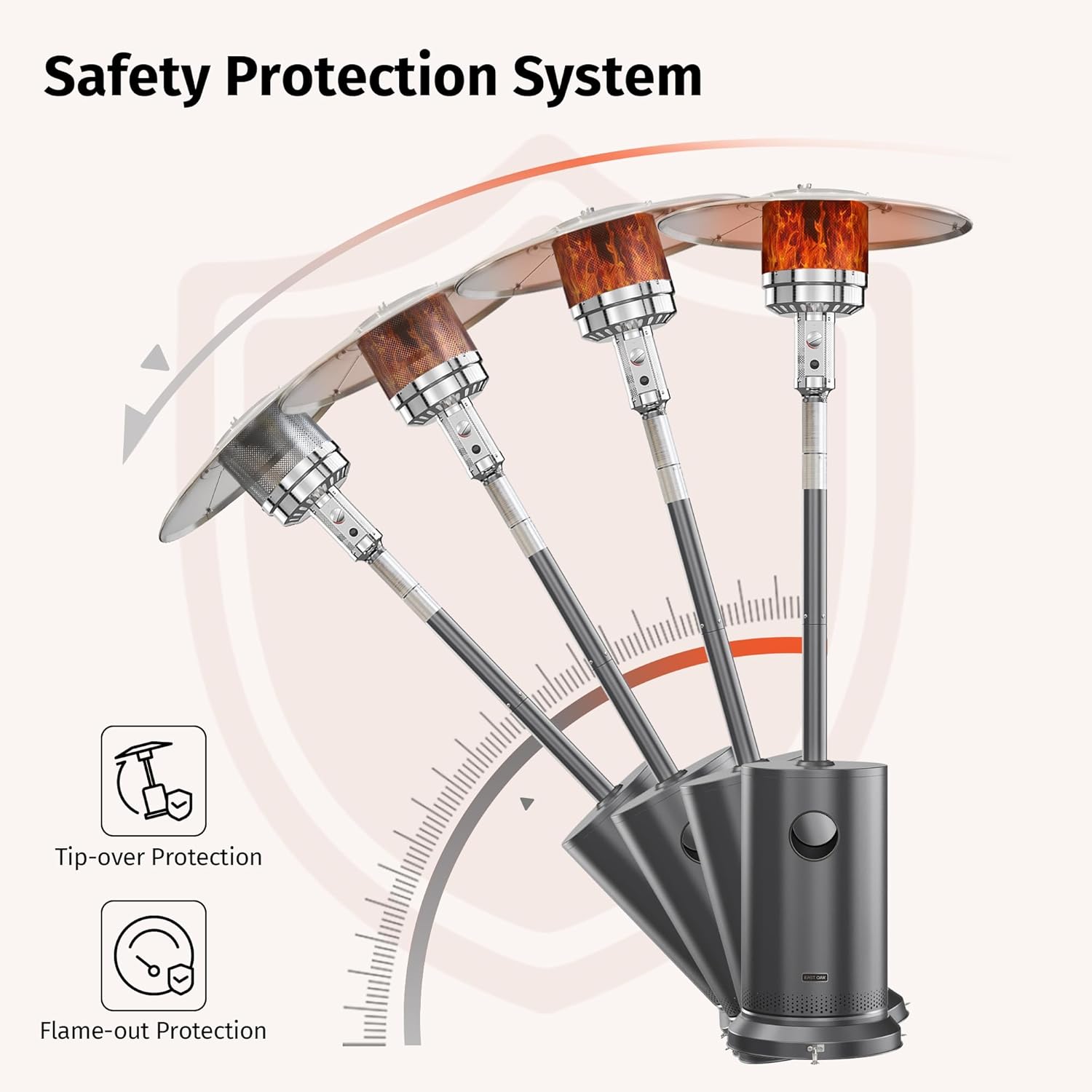 - 𝗗𝗼𝘂𝗯𝗹𝗲 𝗦𝗮𝗳𝗲𝘁𝘆 𝗣𝗿𝗼𝘁𝗲𝗰𝘁𝗶𝗼𝗻 𝗦𝘆𝘀𝘁𝗲𝗺: The Tip-over Protection system will shut off the flame when the patio heater propane is tilted more than 45 degrees. If the flame goes out, the Flame-out Protection system automatically shuts off the gas supply