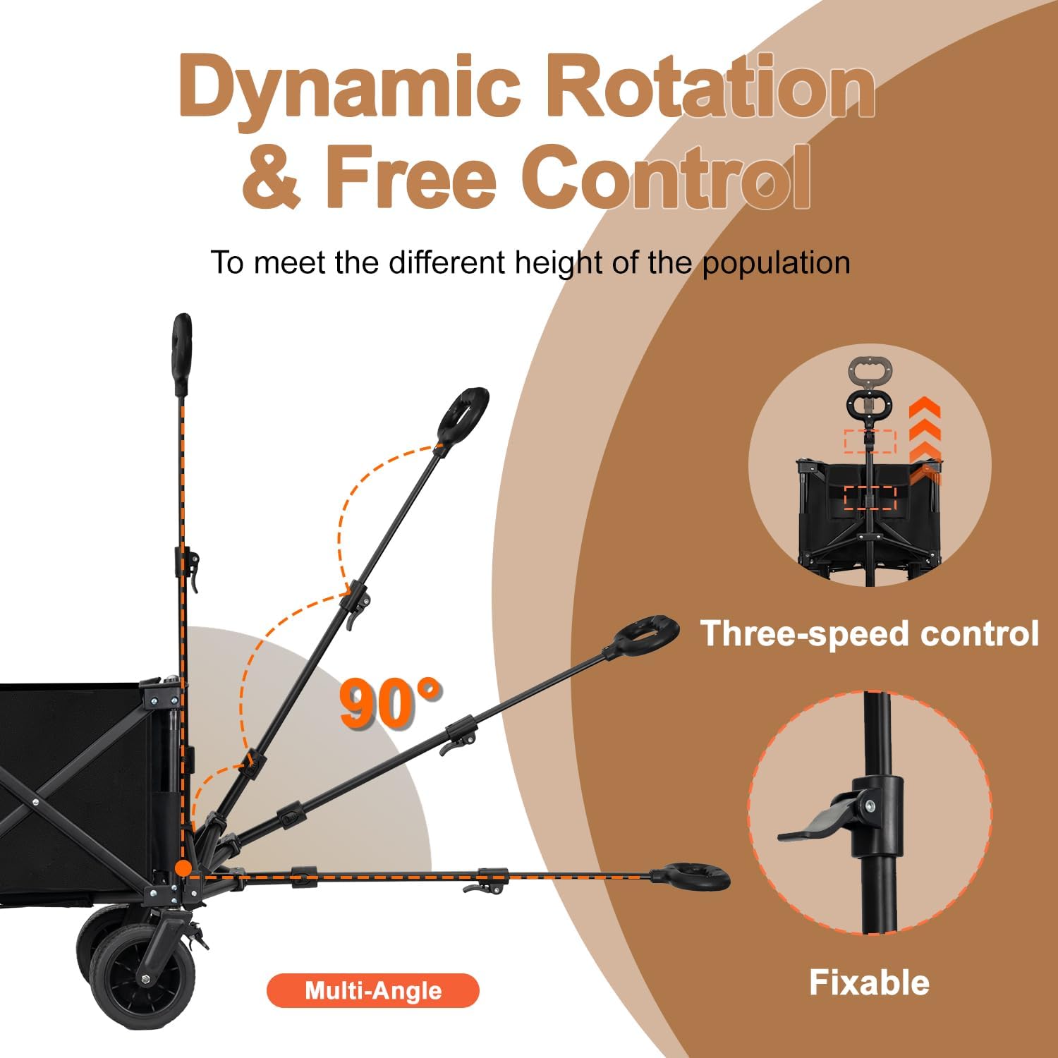 - Folding Wagon Cart-Flexible Maneuverability: The portable wagon is equipped with 360°swivel wheels and brakes for stability on slopes, You can go wherever you want to go, no matter how difficult the terrain is. The telescoping handle can be adjusted at any Angle, Accommodates people of different sizes, Even if your child wants to pull it, it's very easy