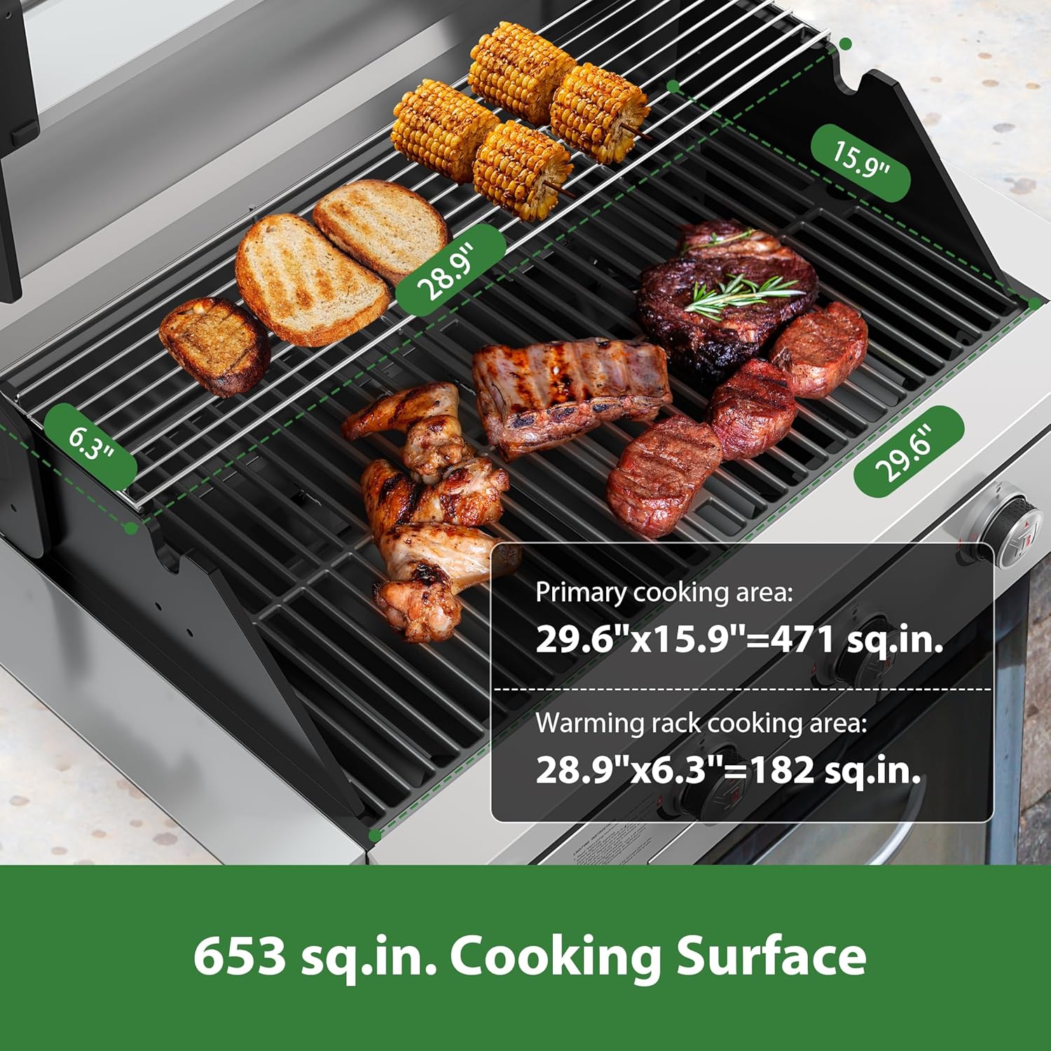 - Spacious BBQ Cooking: Enjoy a massive 653 sq.in. of cooking space with our BBQ grill. The 471 sq.in. primary area with cast iron grates is perfect for grilling, while the 182 sq.in. warming rack keeps food ready to serve. Ideal for cooking multiple dishes at once