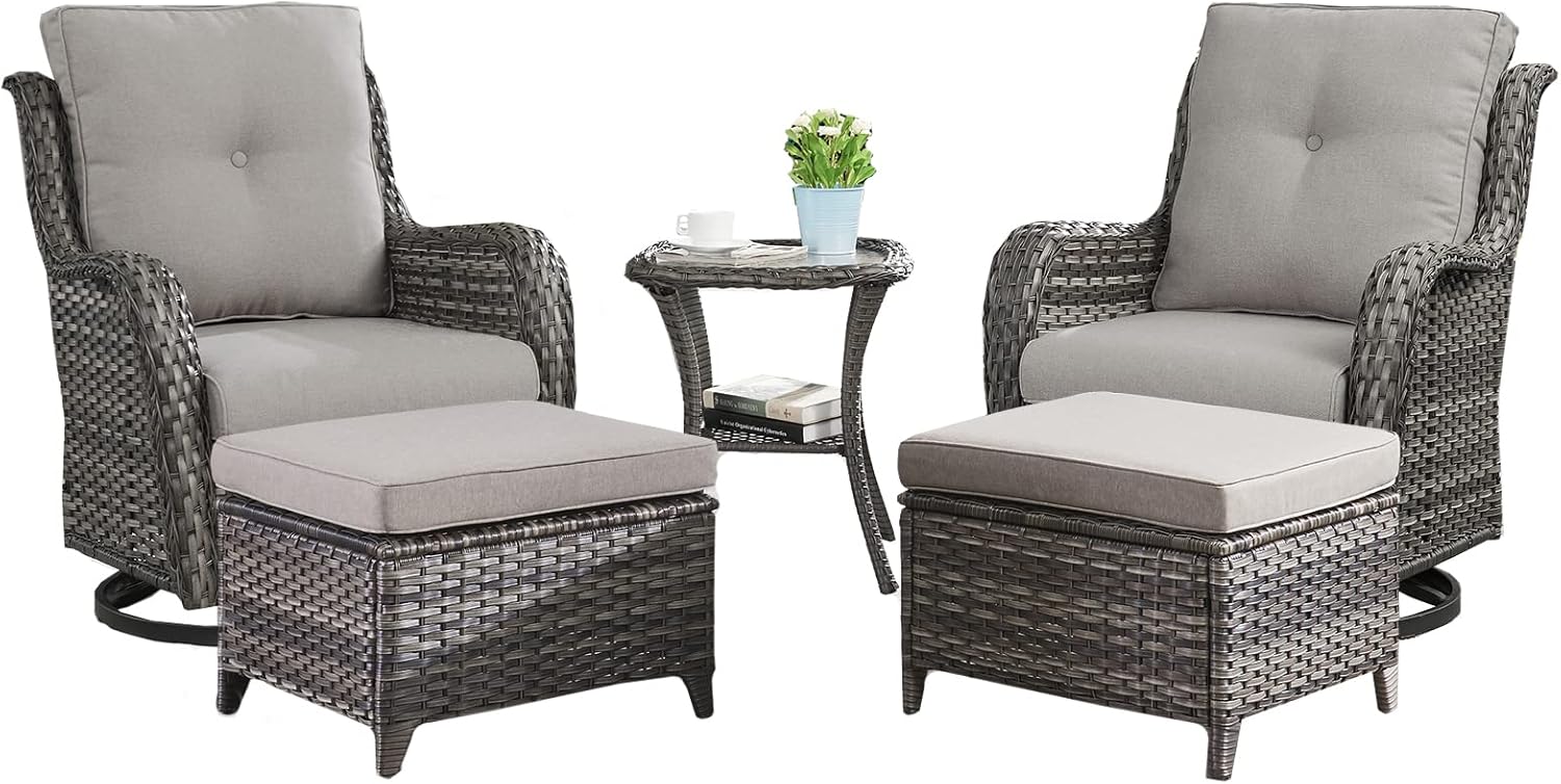 Outdoor Wicker Patio Furniture Set - 5 Pieces Rattan Patio Conversation Set with 2 Rocking Swivel Chairs,2 Ottomans and 1 Side Table for Porch Deck Backyard Garden(Mixed Grey/Grey)