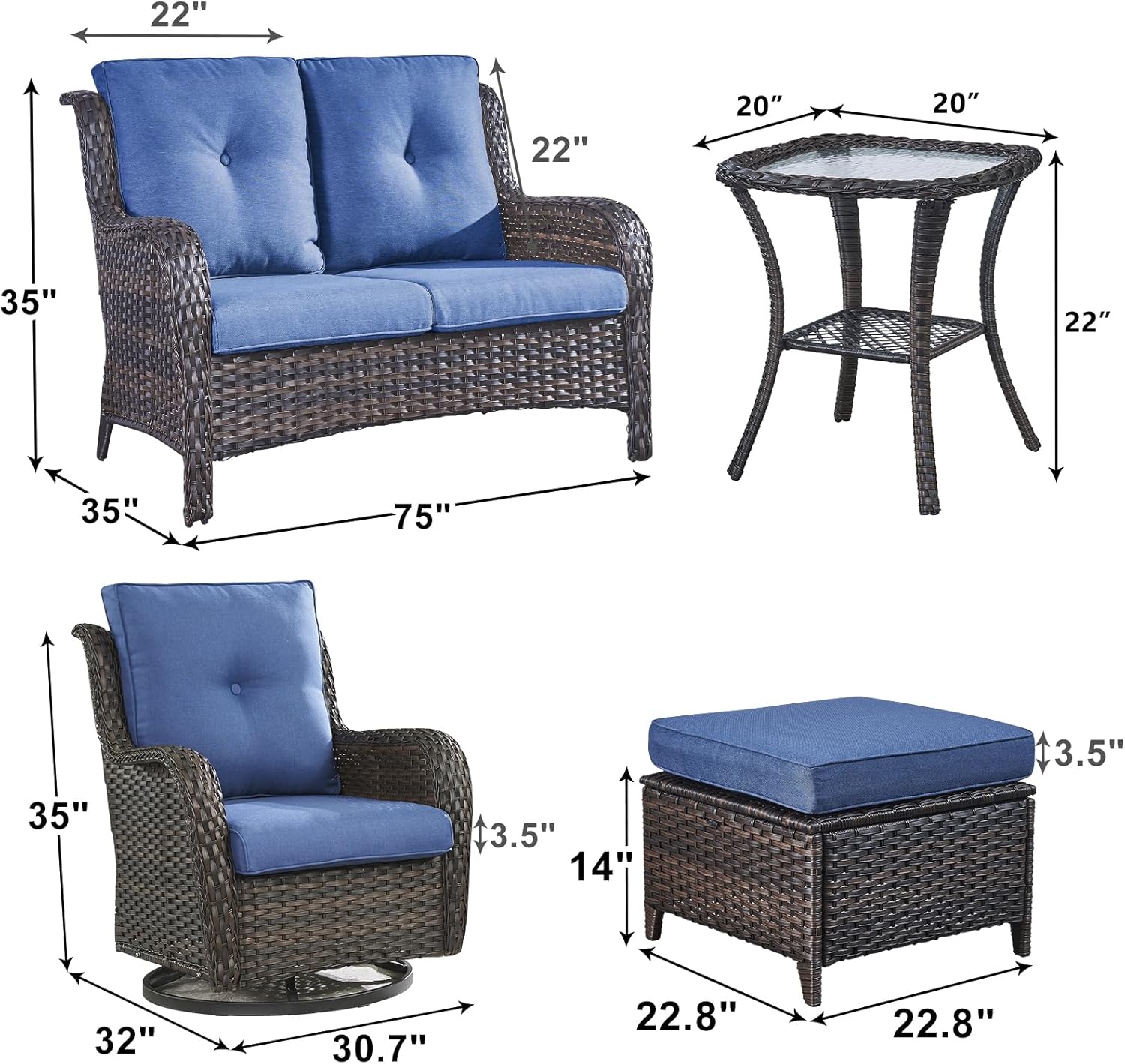 - 【Sturdy & Durable Materials】This outdoor patio swivel chairs,loveseat and ottomans are constructed with hand woven with weather-resistant PE rattan & powder-coated steel frame to make the outdoor seating set sturdy and durable for a long lasting outdoor use.The wicker rocker chair can holds up to 350lbs weight capacity.
