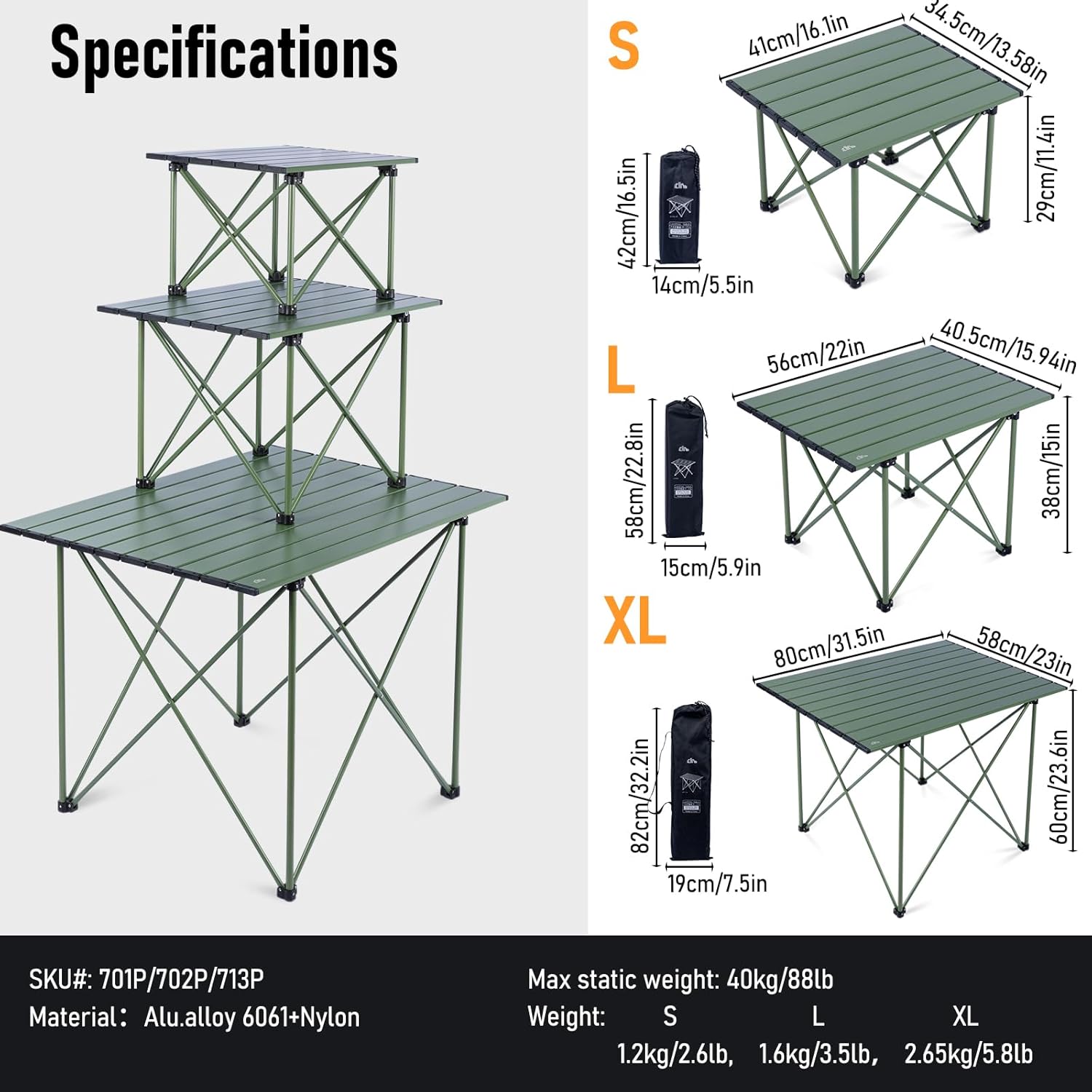 - Ultralight, made of aerospace-grade aluminum alloy, only 3.5 lbs; Max Load 88 lbs; Unlike wooden or nylon-top tables, this table is durable, waterproof, corrosion-resistant, easy to clean; Sturdy joints and anti-slip feet keep the table stable, with legs that won’t fold, bend, or slip on any terrain; Very easy to set up, just open the base frame and attach the tabletop, enjoy your leisure time in seconds, video guide available on this page.