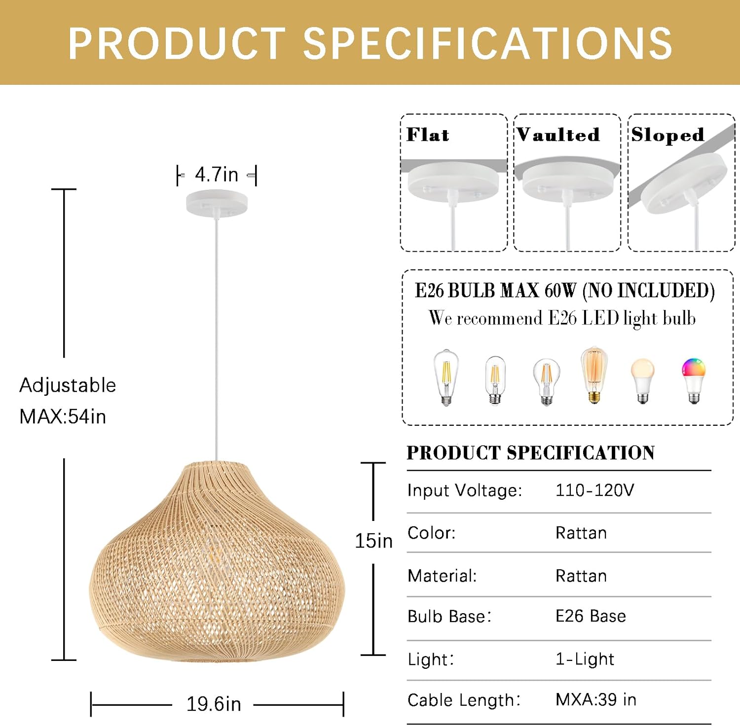 - 【Large Size & Widely Application】The large size of D19.7" * H15" makes this extra large rattan pendant light ideal for dining room. farmhouse, kitchen, stairs, living room, bedroom, loft, nursery, restaurants, coffee, lounges, everywhere.