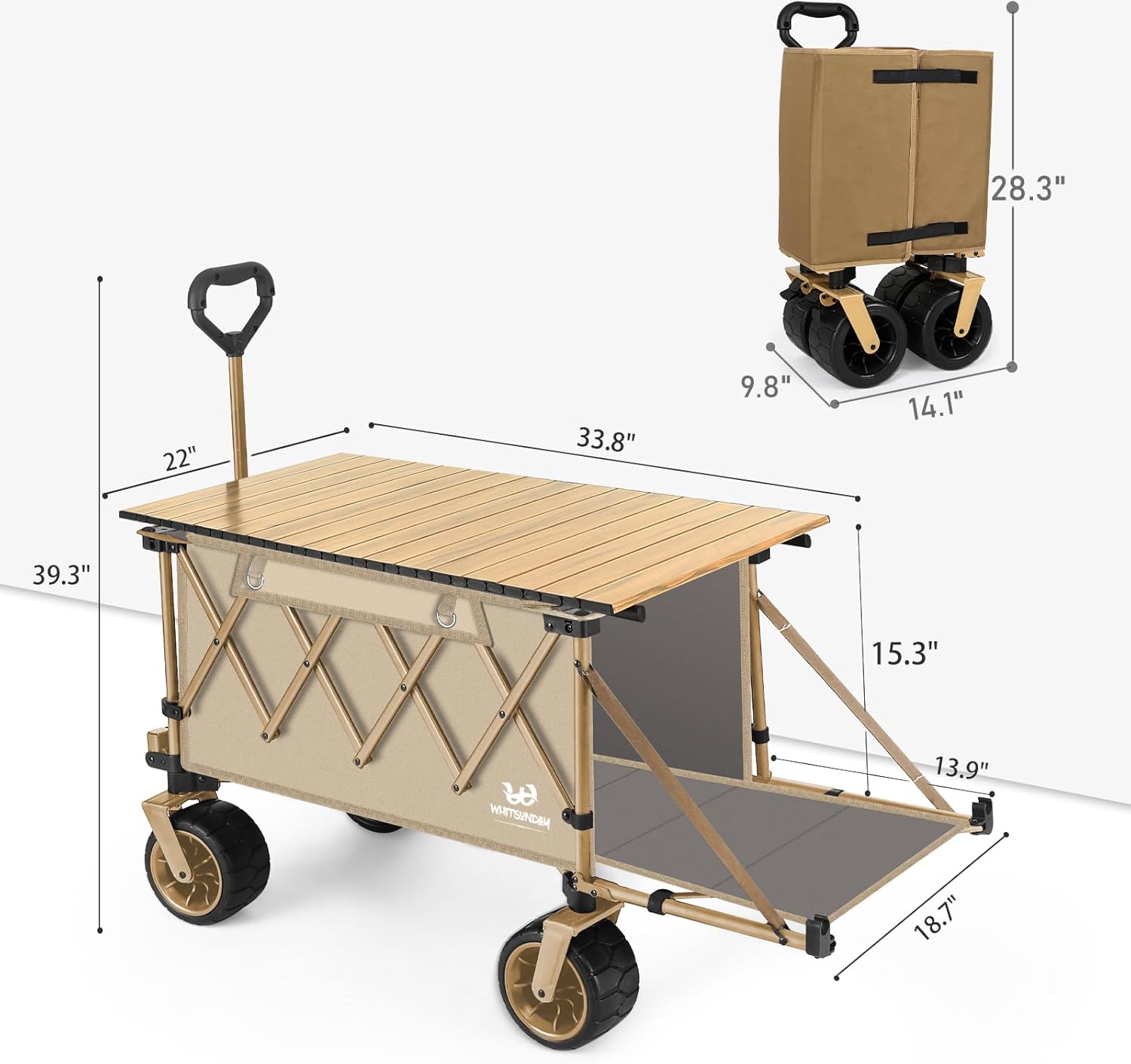 Whitsunday Collapsible Folding Wagon with Table,Heavy Duty Utility Beach Wagons with Opened Tailgate and All-Terrain Wheels for Camping,Garden,Sports Khaki