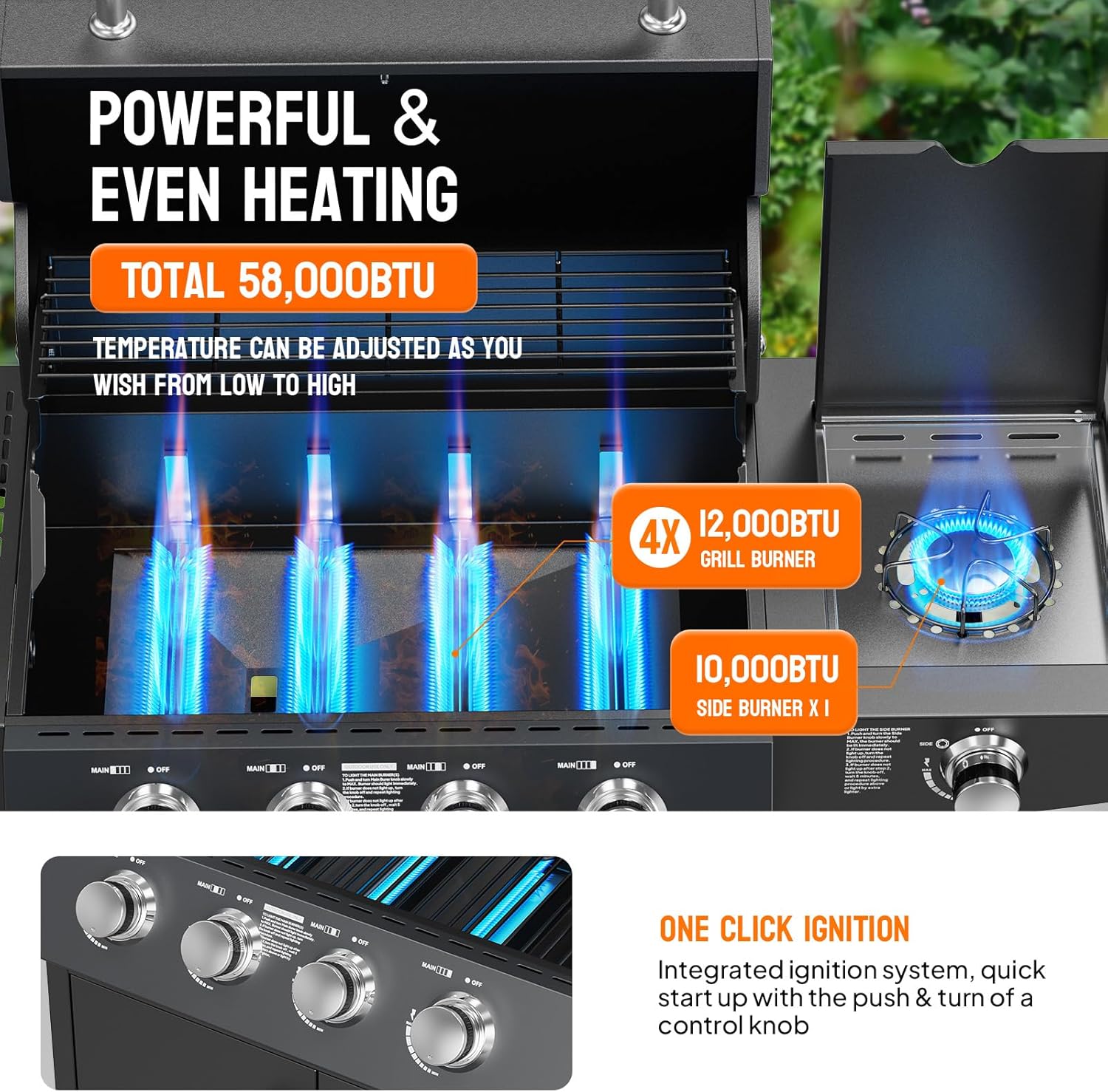 - 🔥【Powerful Heating】This propane grill is equipped with 4 independent stainless steel grilling burners and 1 side cooking burner, which provide a total 58,000 BTU of cooking power including 48,000BTU grilling burners and 10,000 BUT side burner. And you can adjust the flame size as needed, providing a variety of cooking options. Whether it's cooking eggs, pancakes, grilling cheese, or steak, you can do it all with ease
