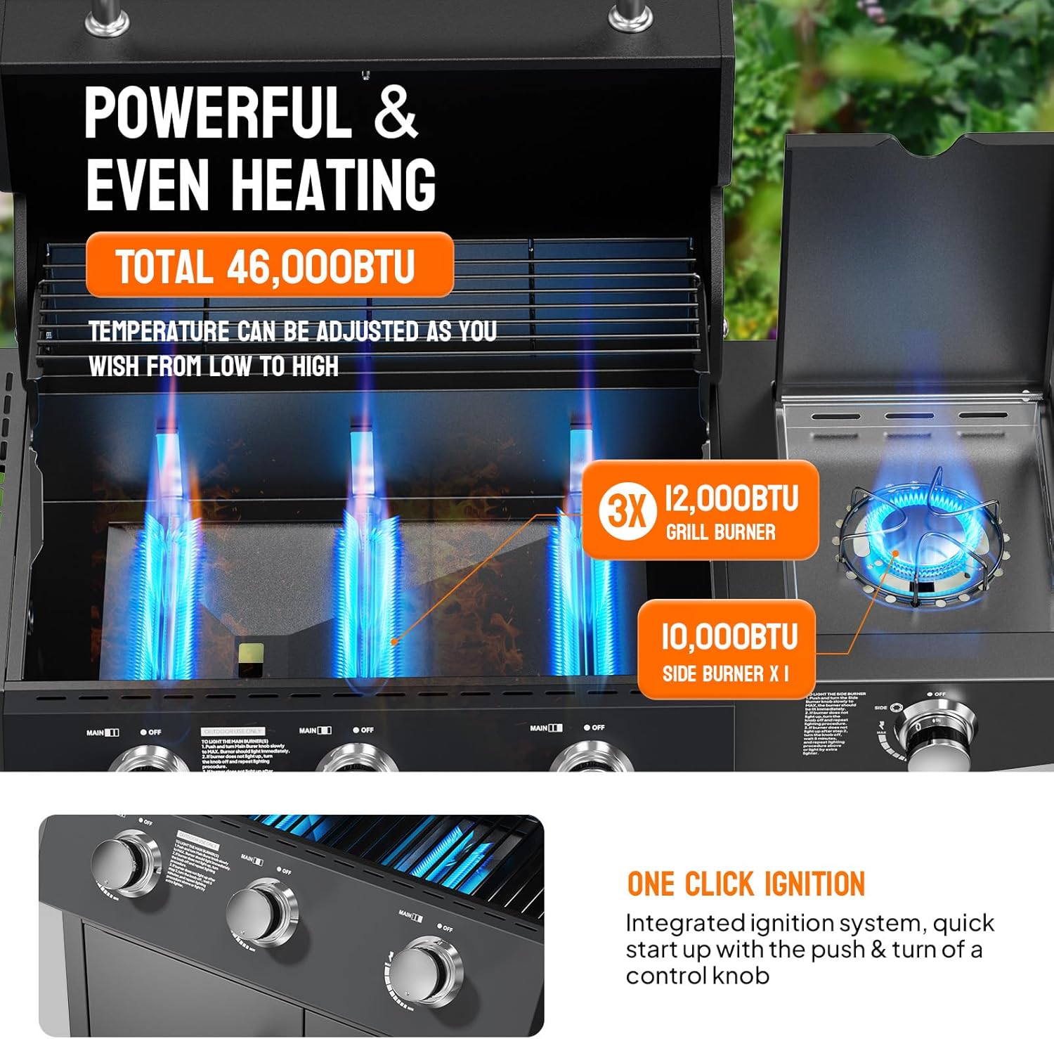 - 🔥【Powerful Heating】This propane grill is equipped with 3 independent stainless steel grilling burners and 1 side cooking burner, which provide a total 46,000 BTU of cooking power including 36,000BTU grilling burners and 10,000 BUT side burner. And you can adjust the flame size as needed, providing a variety of cooking options. Whether it's cooking eggs, pancakes, grilling cheese, or steak, you can do it all with ease