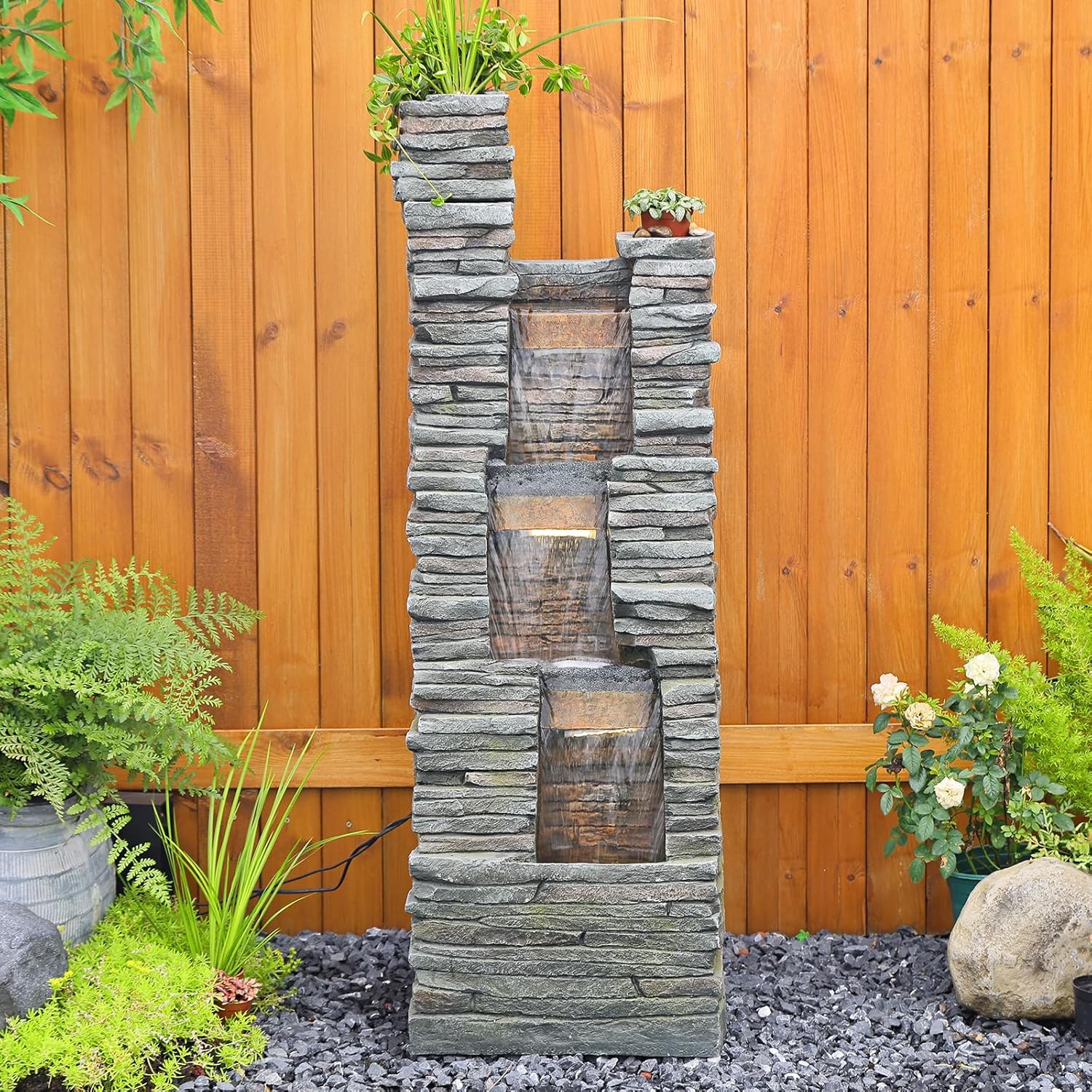 - GARDEN DECOR & LIGHT: Natural Design And Light Weight And Easy To Storage And Move. There Are 3 Built-In LED Lights With A Combined Power of 7.2 W. The Outdoor Water Fountain With Warm Glow LED Lights Is The Perfect Landscape For Your Outdoor Decor And Fits Put On Your Porch, Backyard, Garden or Lawn.