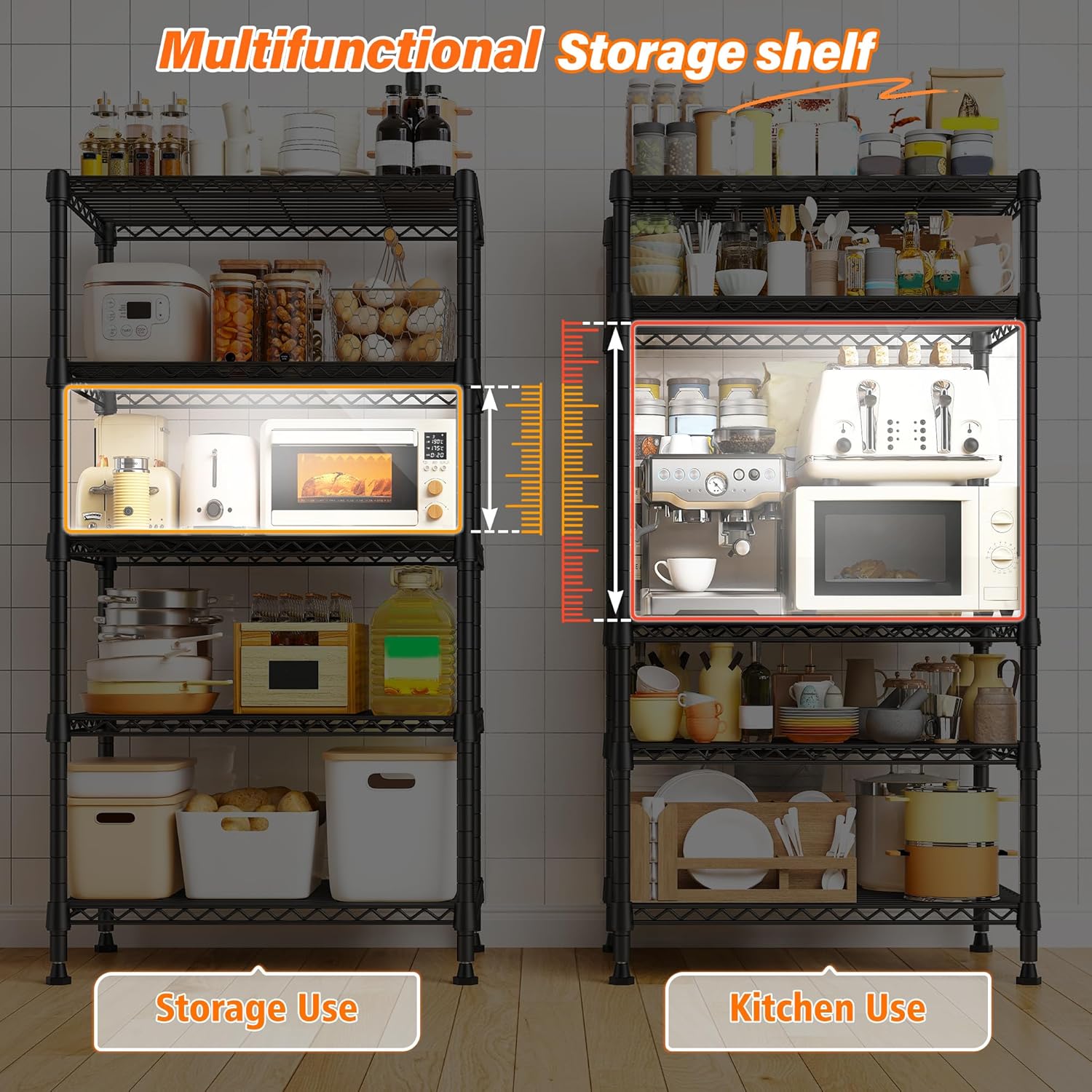 - 【Height adjustable Wire Shelf】Our heavy-duty storage rack is height-adjustable,witch means the height of each tier on this storage racks can be individually adjusted according to the actual demands of storing large or small items, thereby optimally accommodating a range of varying storage requirements such as Laundry,Pantry,Kitchen,Living Room,Closet.