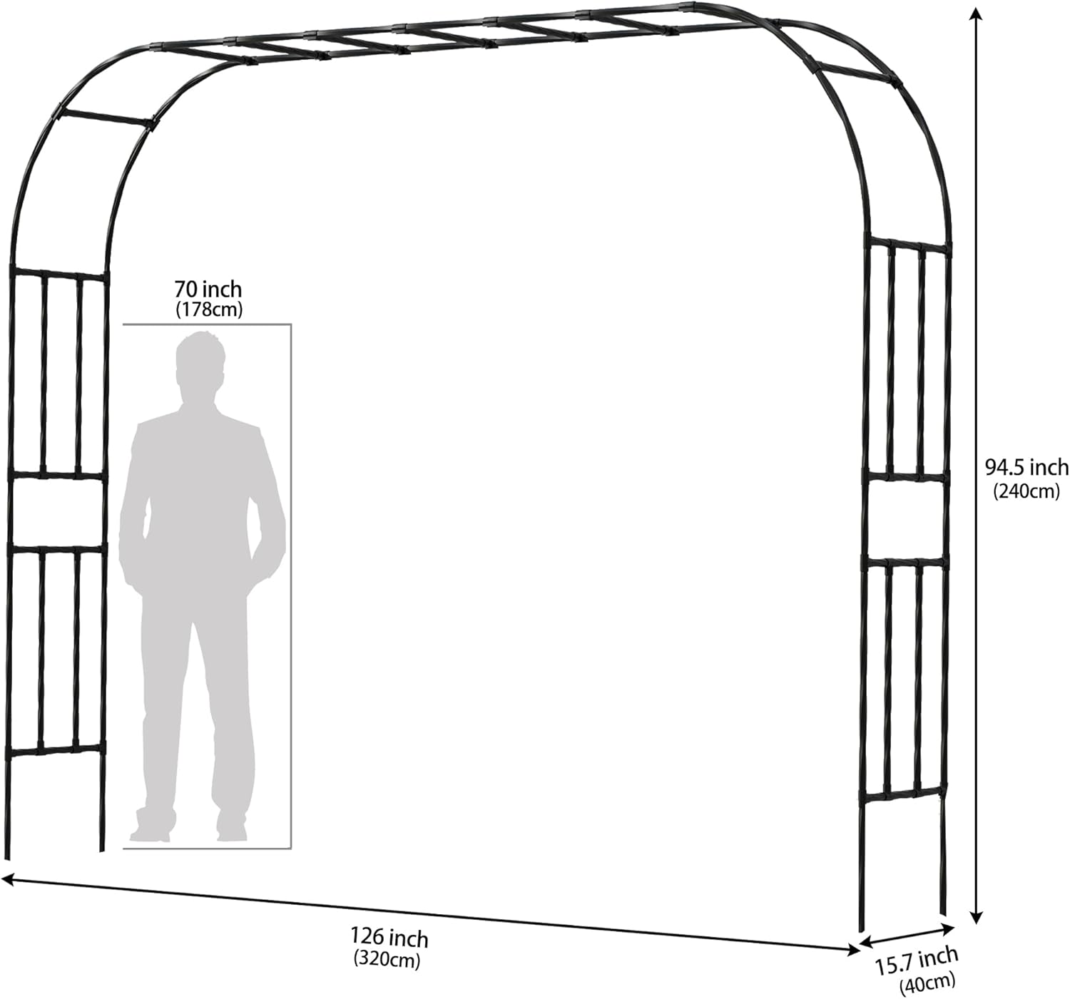 - [Perfect Height Design] - Standing at 7.9FT(240cm) extra tall, this metal garden arch allows easy passage and serves as an ideal walkway in your garden. It adds elegance and functionality to your outdoor space, dimension is 126" x 15.7" x 94.5"(320cm x 40cm x 240cm), making trellis arch suitable for gardens, backyards, lawns, beaches, hotels, pathways and more.