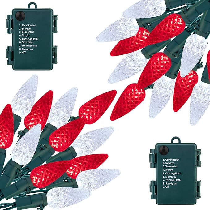 - 【 8 Lighting Modes 】- There are 8 different modes for the C6 Christmas string lights, including waves, sequential, slow glow, flashing, slow fade, twinkle, and combination, as well as standard on and off. It can be controlled by pressing the button on the battery box. Ideal for your everyday decor as well as holiday decoration.
