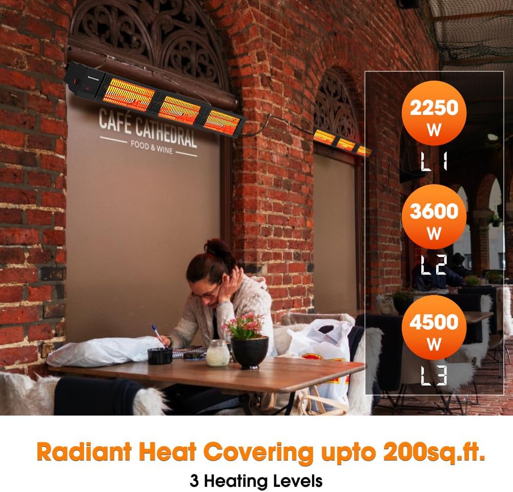 - 170 SQUARE FOOT SPACE - Powerful 4500W output, producing heat to cover up to 200 sq.ft. Recommended least mounting height 7.88 feet. Must be hardwired to dedicated circuit breaker, including a 6.3 feet cable cord requiring wire connection