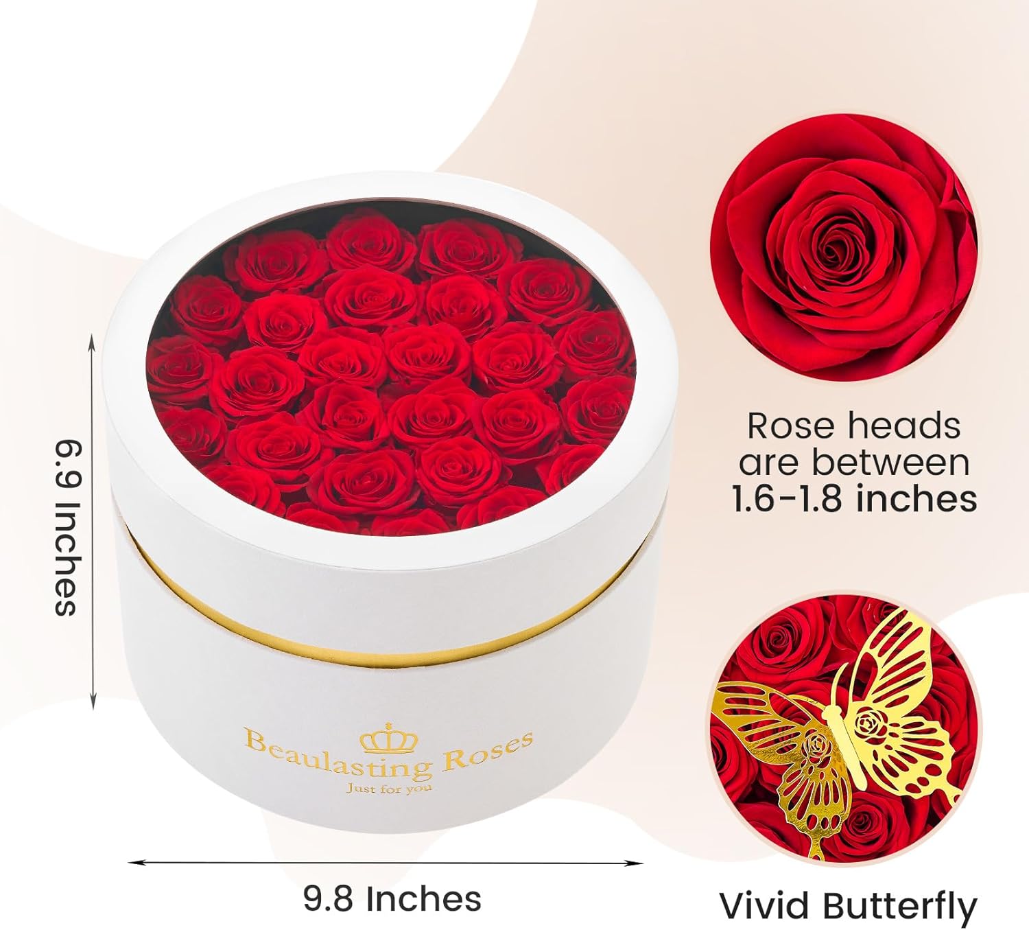 - Elegant display box: The high-quality round white velvet box feels luxurious and understated, putting all the focus on the 27-piece bright, everlasting roses - a timeless gift your loved one will enjoy for over a year. The PVC transparent cover also displays the preserved roses well
