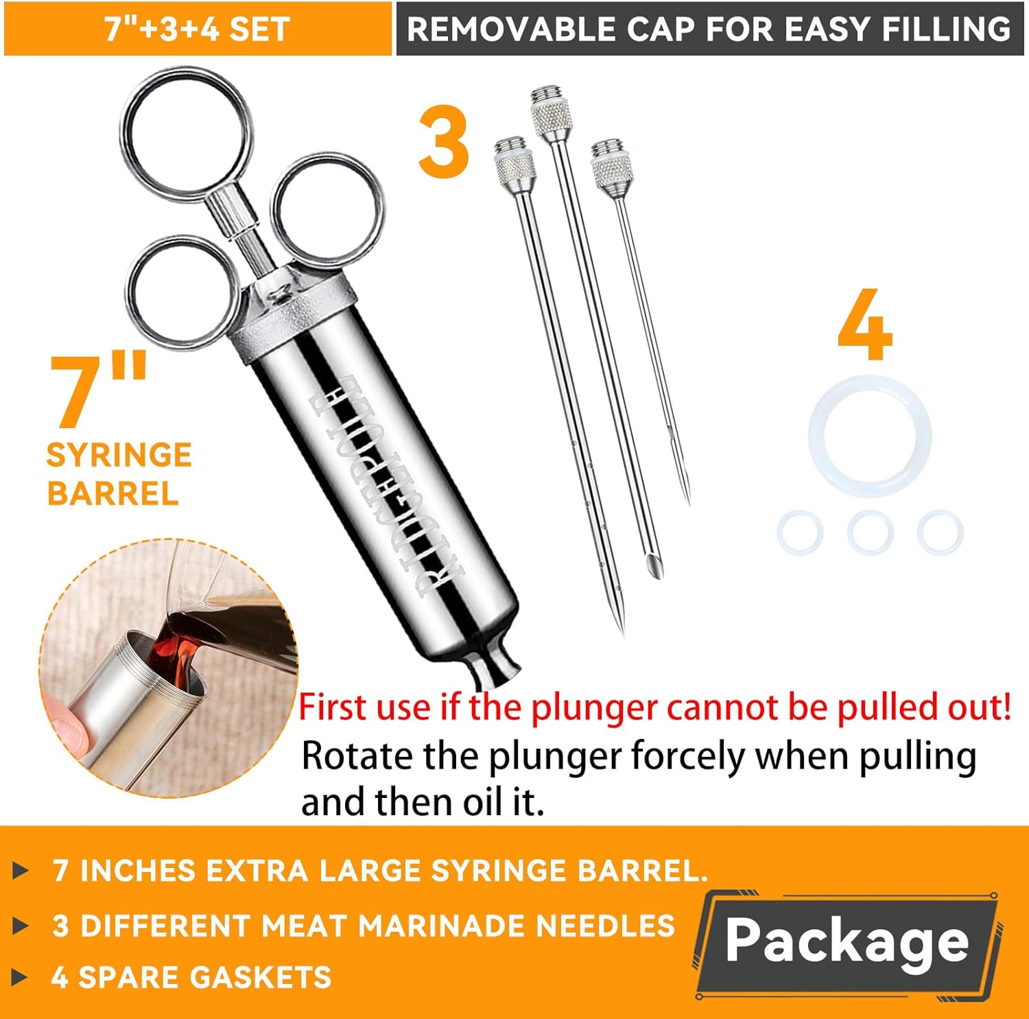 - [Convenient & Fast Cleaning] - All parts of our meat injector are detachable for easy cleaning. Besides, we provide two needle brushes to help you clean it faster and more thoroughly. When you use the seasoning injector, cleaning is straightforward and efficient. Our meat injectors are designed for your convenience, making post-cooking cleanup a breeze.