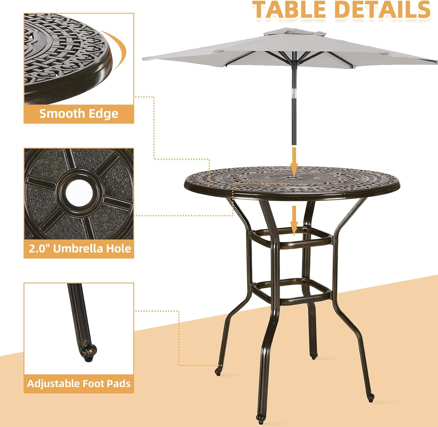 - 【Humanized Design】Patio bar height chairs with ergonomic high back, curved armrest and solid footrest which can support a great seating experience. Upgraded adjustable foot knobs to ensure the even legs while assembled, and more engraved details add an aesthetic touch of artful appeal for this counter height barstools. Featuring a 2” umbrella hole in the center of the table for your favorite umbrella. Putting on an umbrella can protect guests and the food on the table from direct sunlight.