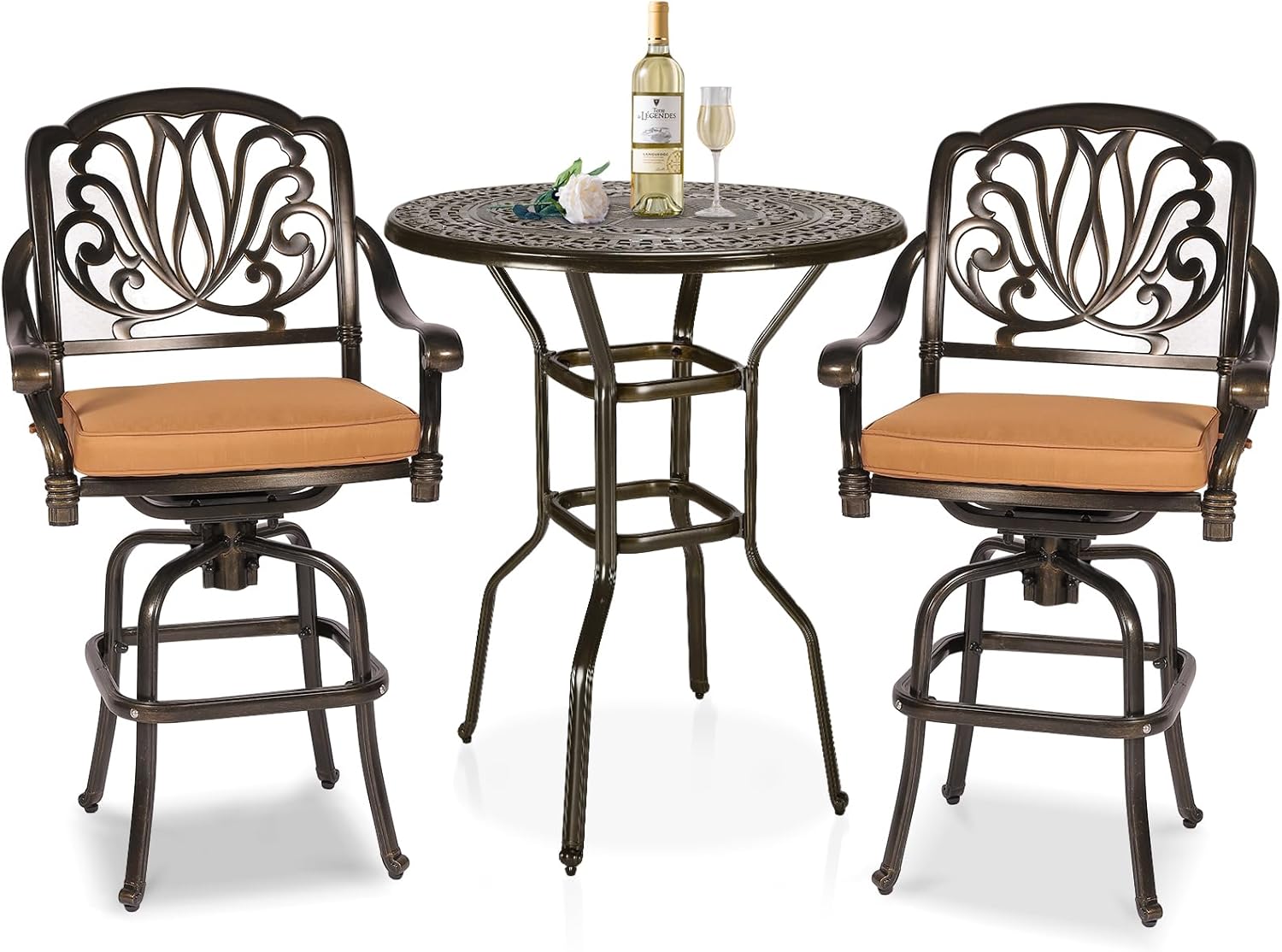 - 【Premium Materials】The outdoor swivel bar stools set is made from cast aluminum for long-term durability. Resistant to rust, weather, fade, crack. The patio furniture set features an oil-rubbed bronze finish for a timeless look that is designed to withstand the elements year-round. If you use this set by the pool, it’s all-weather quality helps prevent water damage caused by wet swimsuits and splashing. It is also easy to clean, you just need to use a cloth to easily wipe away the dirty things.