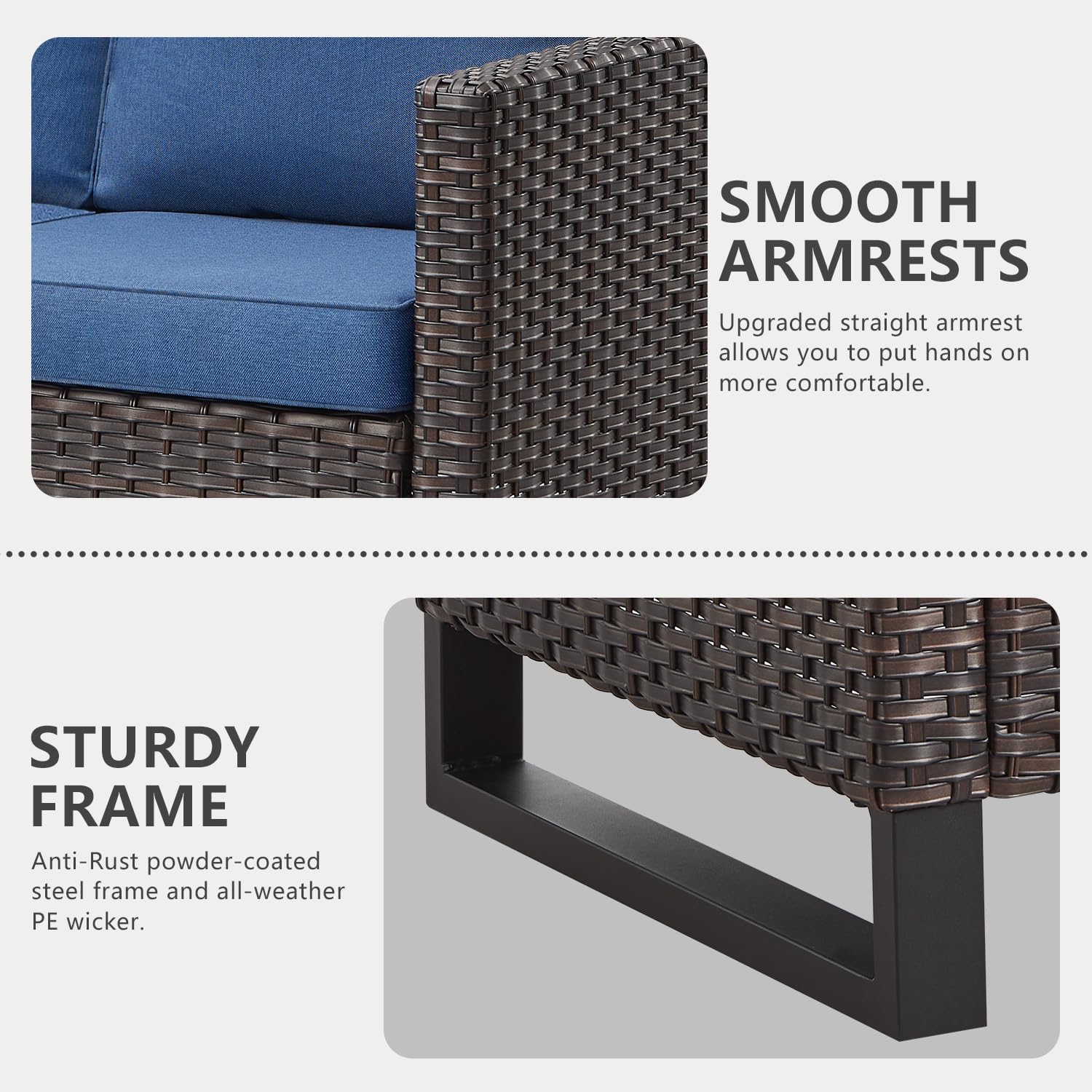 - 【Comfortable 4inch Thick Cushions】This outdoor furniture features deep and wide seats with 4-inch thick sponge-padded cushions,Offers good resilience, not easy to deform or slide, also protect your lumbar and offer a comfortable sitting experience.Water-repellent polyester cover with zipper,Easy to clean and keep.