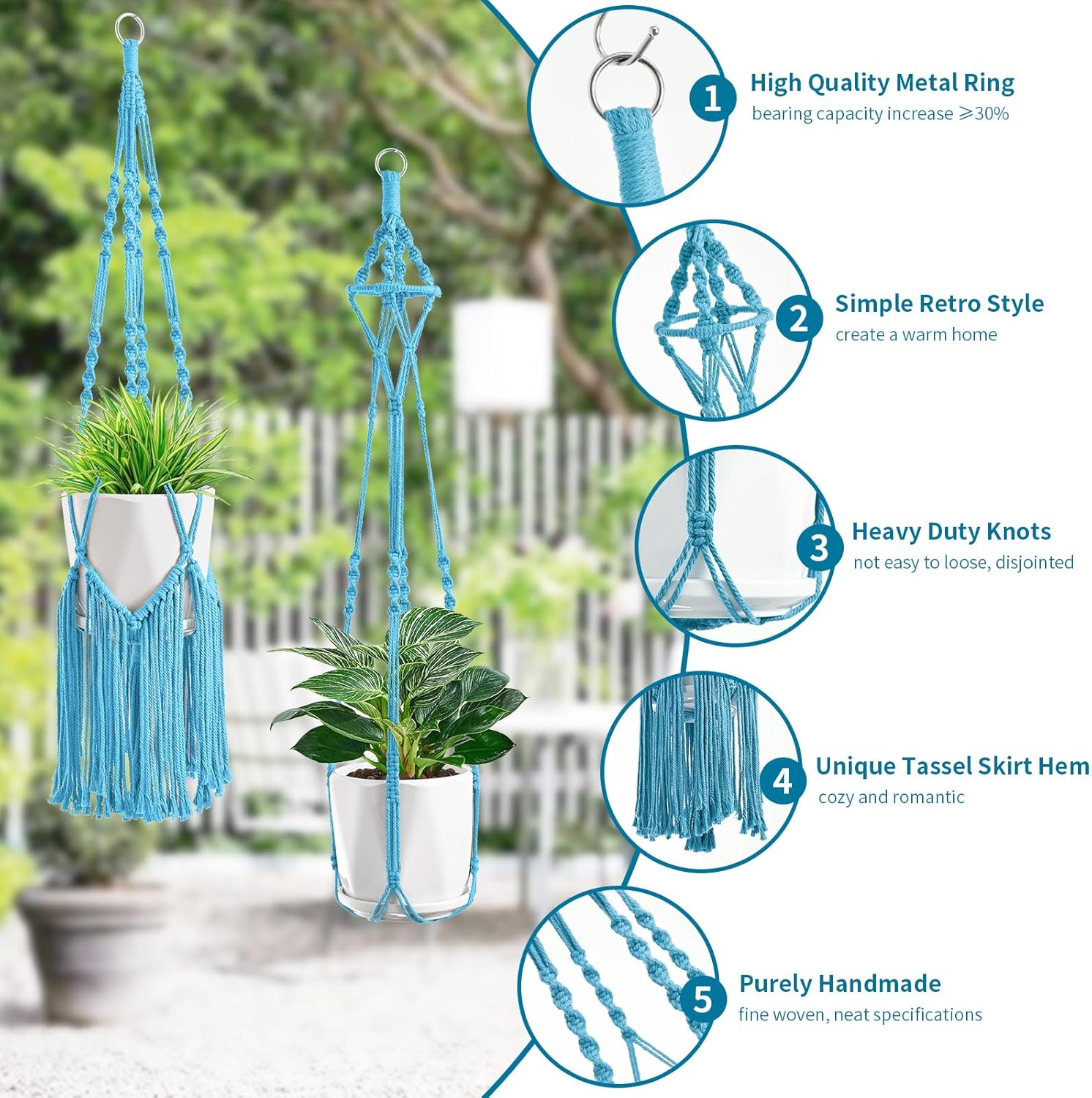 - HEAVY DUTY KNOTS: Hanging plant holders are handcrafted from high quality, strong, soft and sturdy cotton rope. Perfect for hanging all kinds of plant pots, including ceramic pots, metal pots, plastic pots, glass pots, etc., Ideal pot size is 6-10"