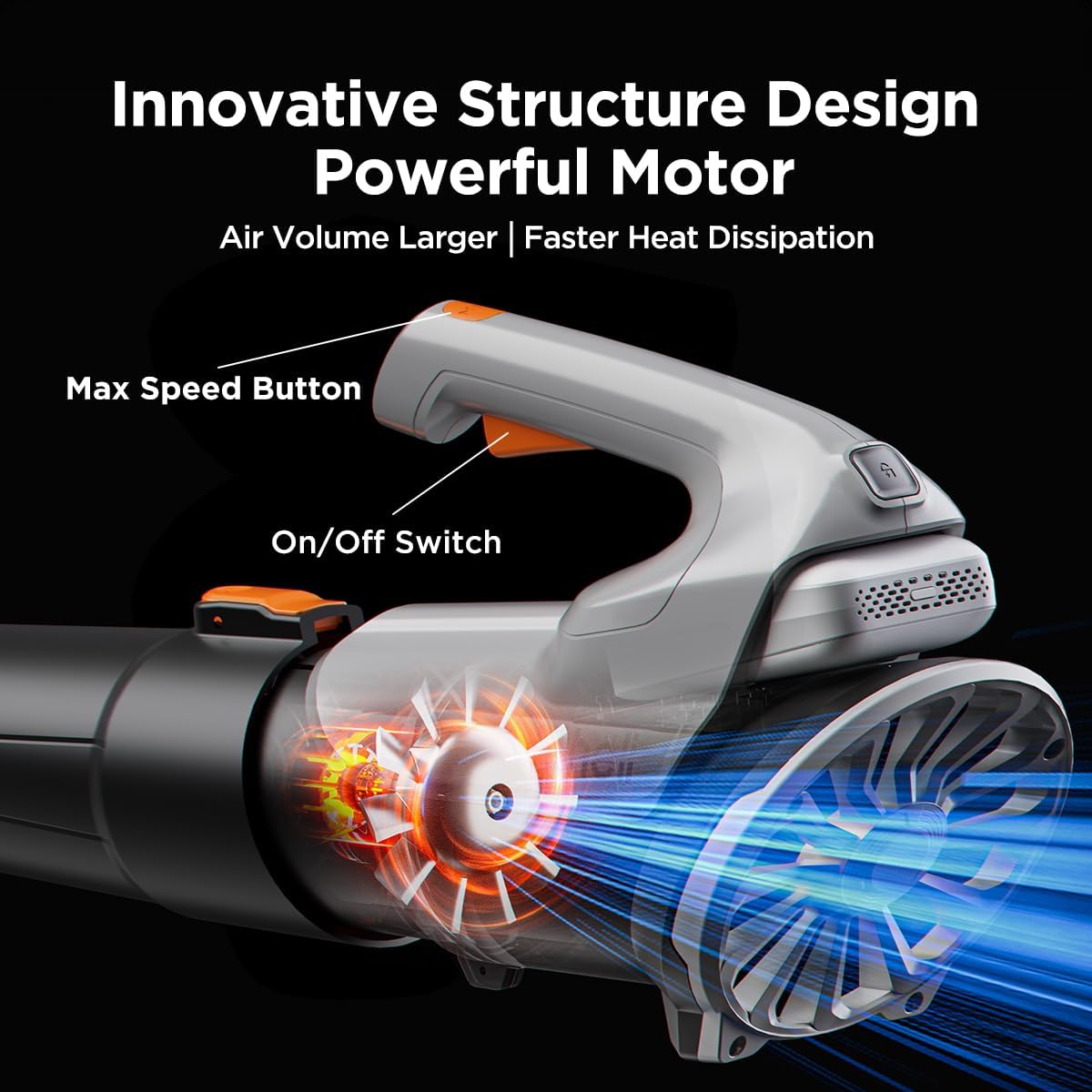 - With a one-touch speed control, our cordless leaf blower boasts 2-speed modes and a cutting-edge fan blade design that ensures efficient cooling to extend its lifespan while maintaining optimal performance.