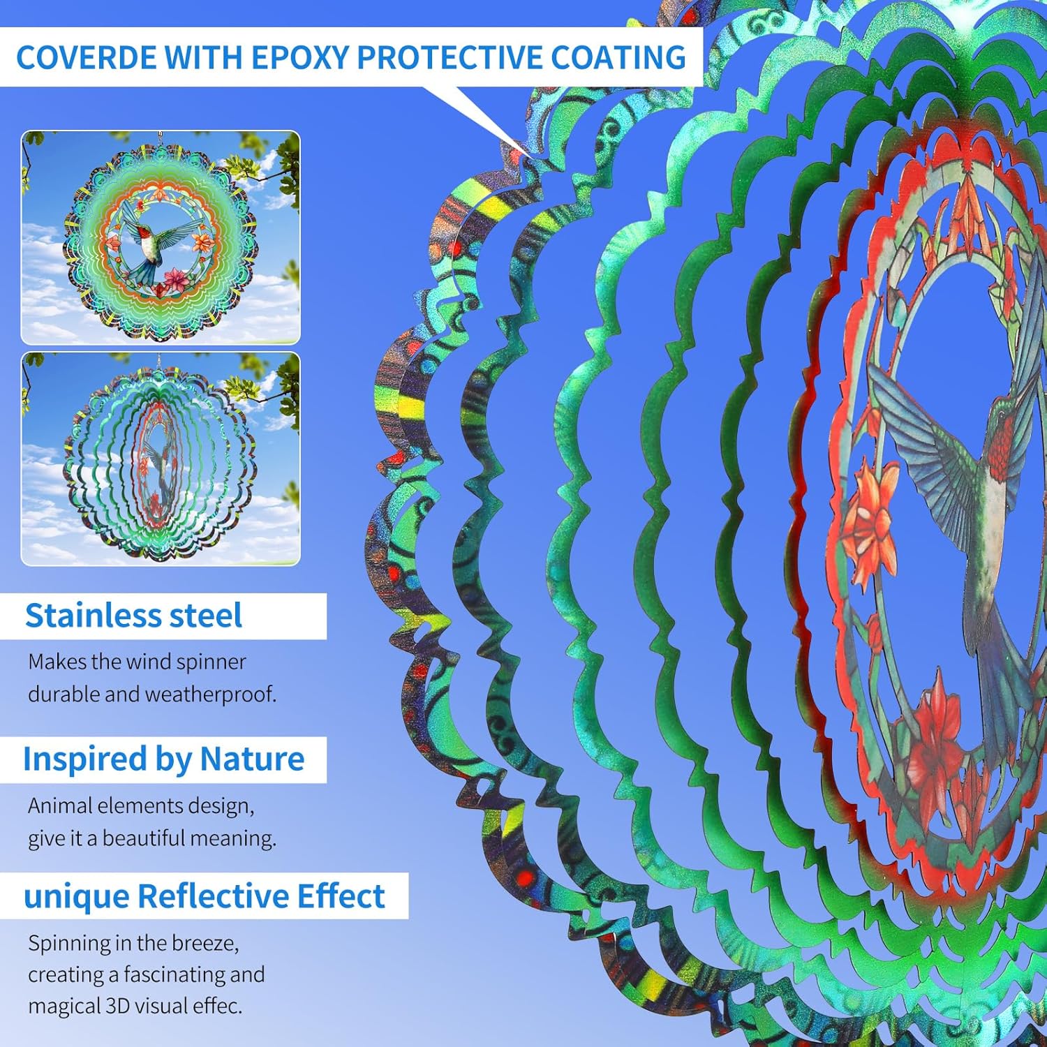 - Captivating Magical 3D Visual Effect - Cawalap Hummingbird Wind Spinner surface of the metal wind spinner is additionally coated with a unique layer of colorful reflective material, when the breeze blows, the reflective colorful glitter material gives off a sparkling, creating a fascinating and magical 3D visual effect, its beautiful light reflecting and attractive view, for balcony, garden, patio, porch, backyard, courtyard, both indoor and outdoor will beautify decor your home.