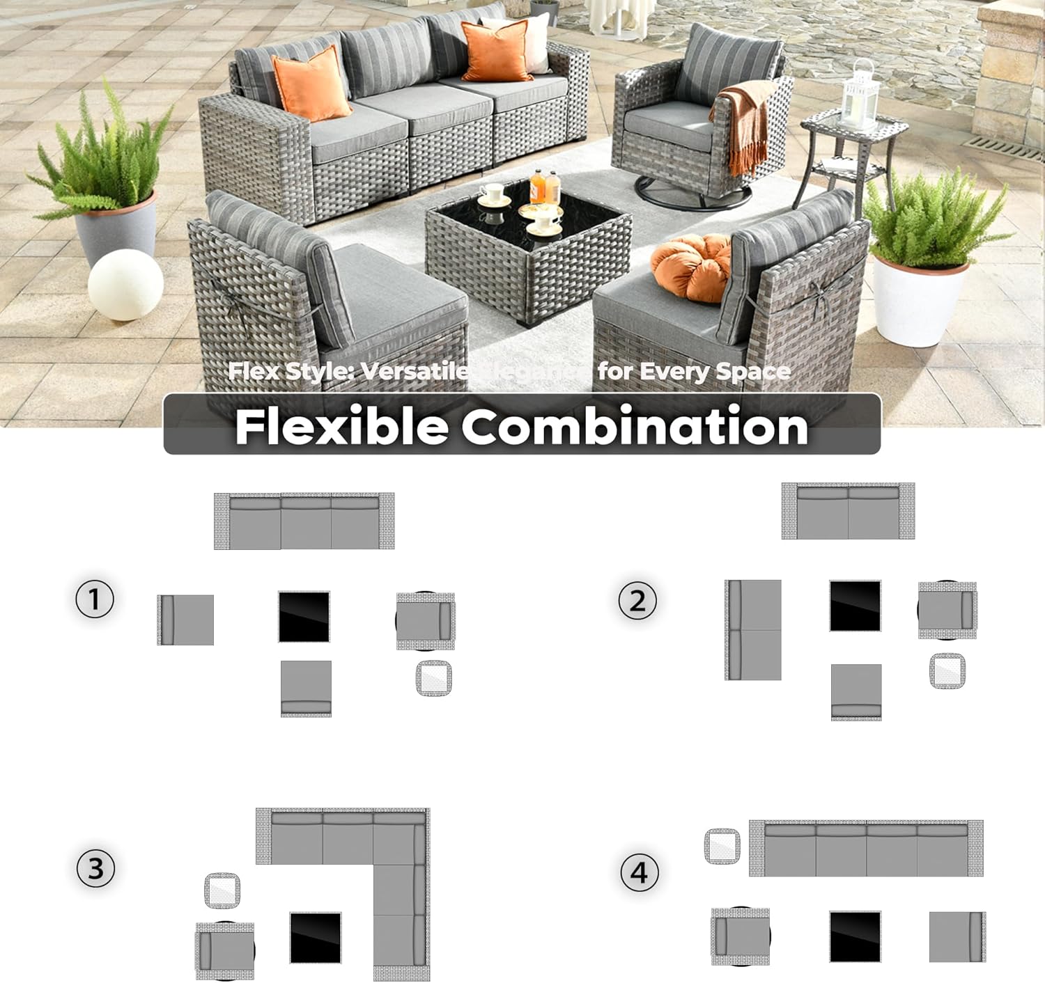 ovios 8 Pieces Patio Furniture Set, Outdoor Wicker Sectional Sofa with Swivel Chair Coffee Table, Modern Modular Deep Seat Rattan Couch Conversation Sets, Dark Gray Stripe