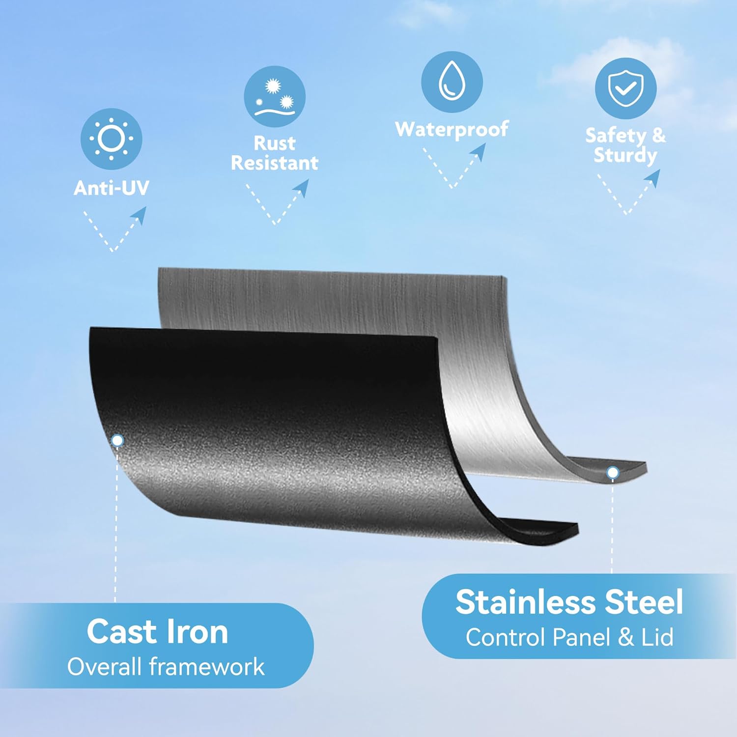 - GRIDDLE GRILL COMBO: Griddle or grill, that won't be a problem anymore! This 2-burner gas grill features 191 square inches of grilling area and 171 square inches of griddle plate space. With its cast iron griddle plate and chrome-plated grates, it offers ample cooking space for a variety of dishes, from pancakes to teppanyaki-style foods. Ideal for outdoor camping, tailgating, picnics, and barbecues