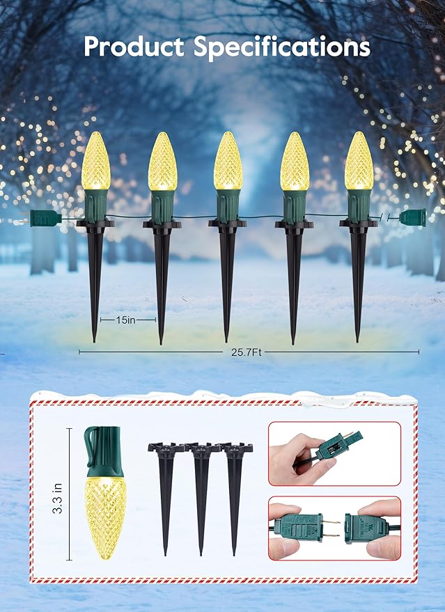 - Connectable Christmas Walkway Lights: Up to 21 strands connectable to optimize the need for larger area lighting and festival decorations. With the anchor spike plugging in the snowfield, the Christmas lights for pathway are definitely the blooming flowers in the winter garden