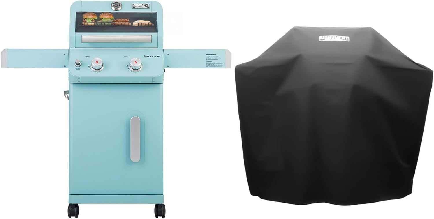 Monument Grills 2-Burner Stainless Steel Liquid Propane Gas Patio Garden Barbecue Grill with Clearview® Lid, Knob Control and Two Foldable Shelves Mesa200G with BBQ Cover, Green
