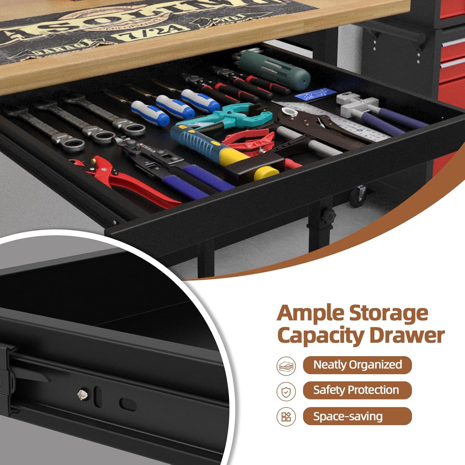 - [Easy Mobility and Versatile Storage]: With four heavy-duty 360° locking casters, moving becomes effortless, providing mobility for your workstation anywhere. The large drawer helps organize all necessary tools and accessories, ensuring quick access and heightened productivity.