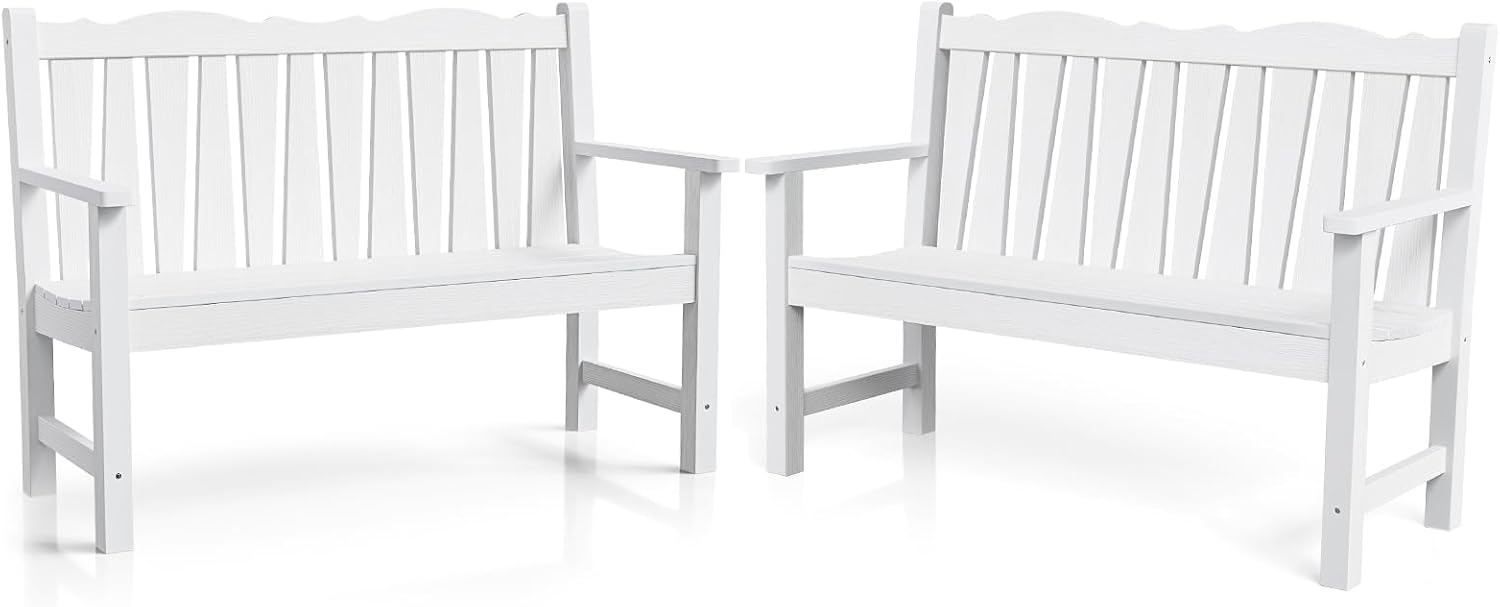 Outdoor Bench Set of 2, Weatherproof Garden Benches for Outdoors, All Weather HIPS Patio Bench Holds up to 800lbs, Never Rot or Fade, Comfort Bench for Porch Garden Patio Yard and Park(White)